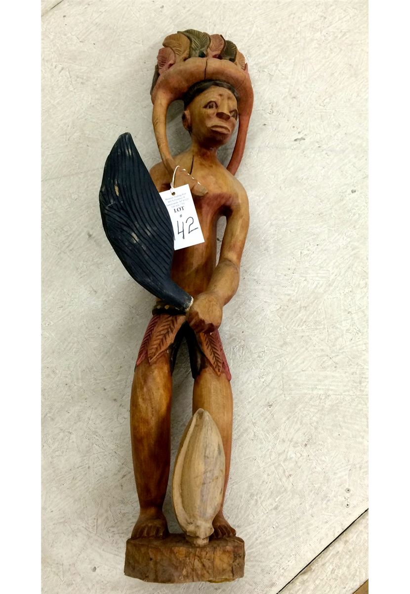 This hand carved wood statue is of a Native. It measures 42" high. In good shape except there are a couple of dry weather cracks.