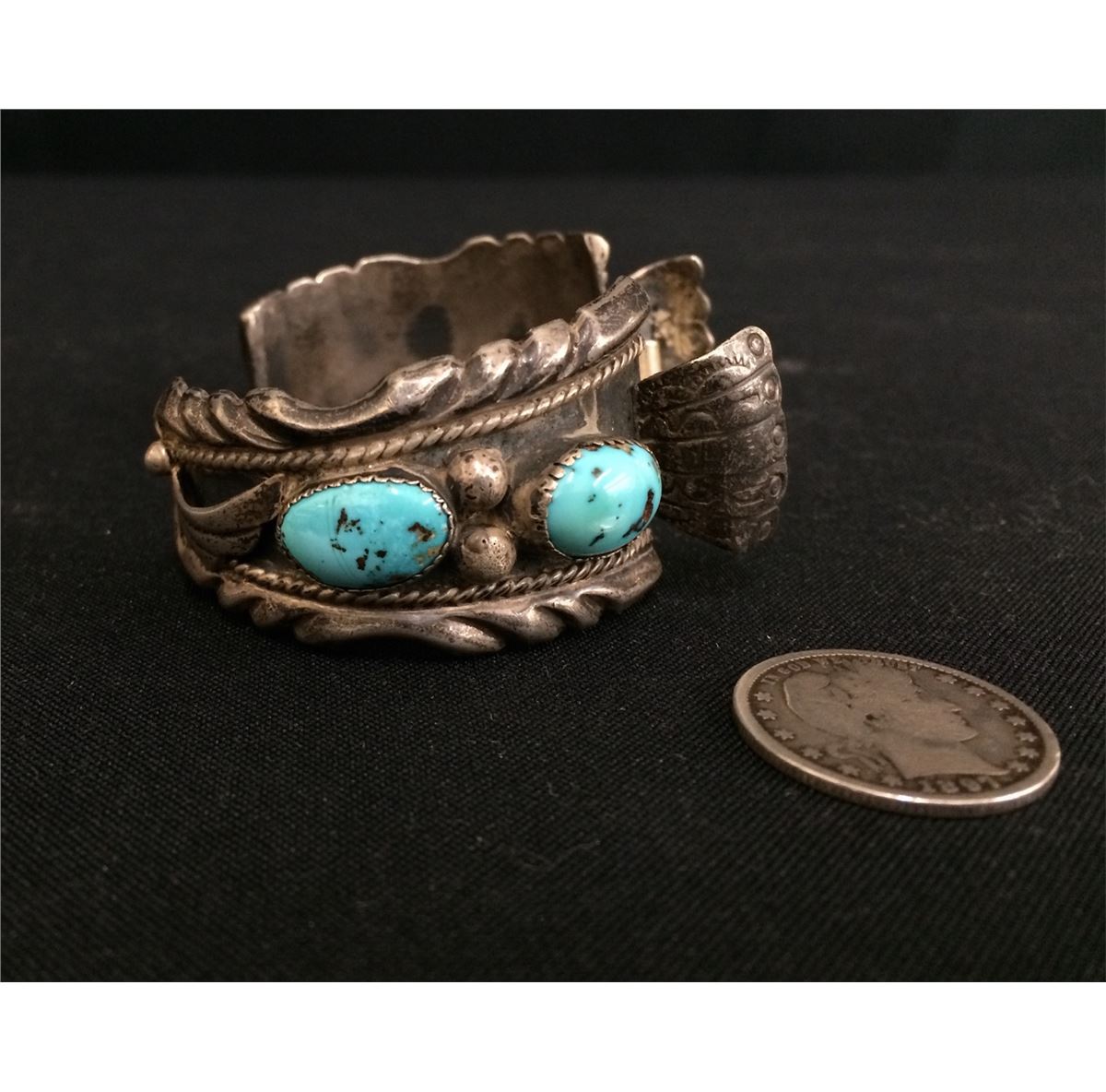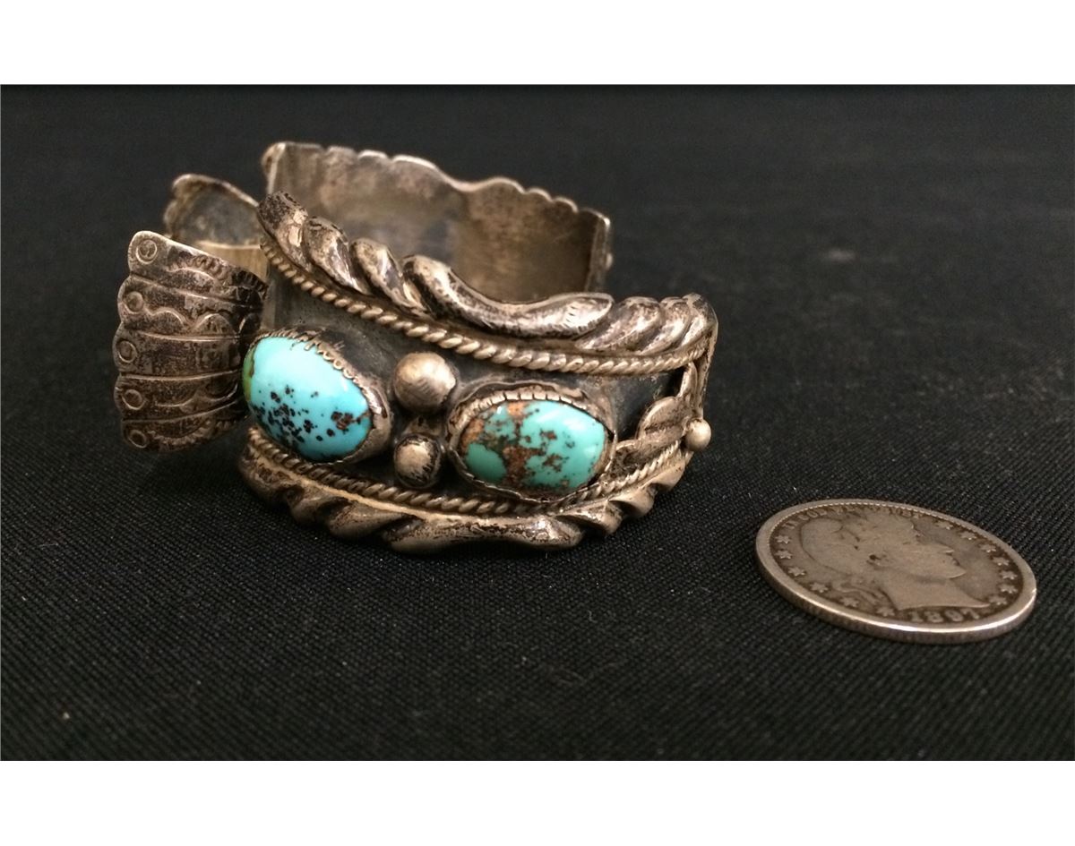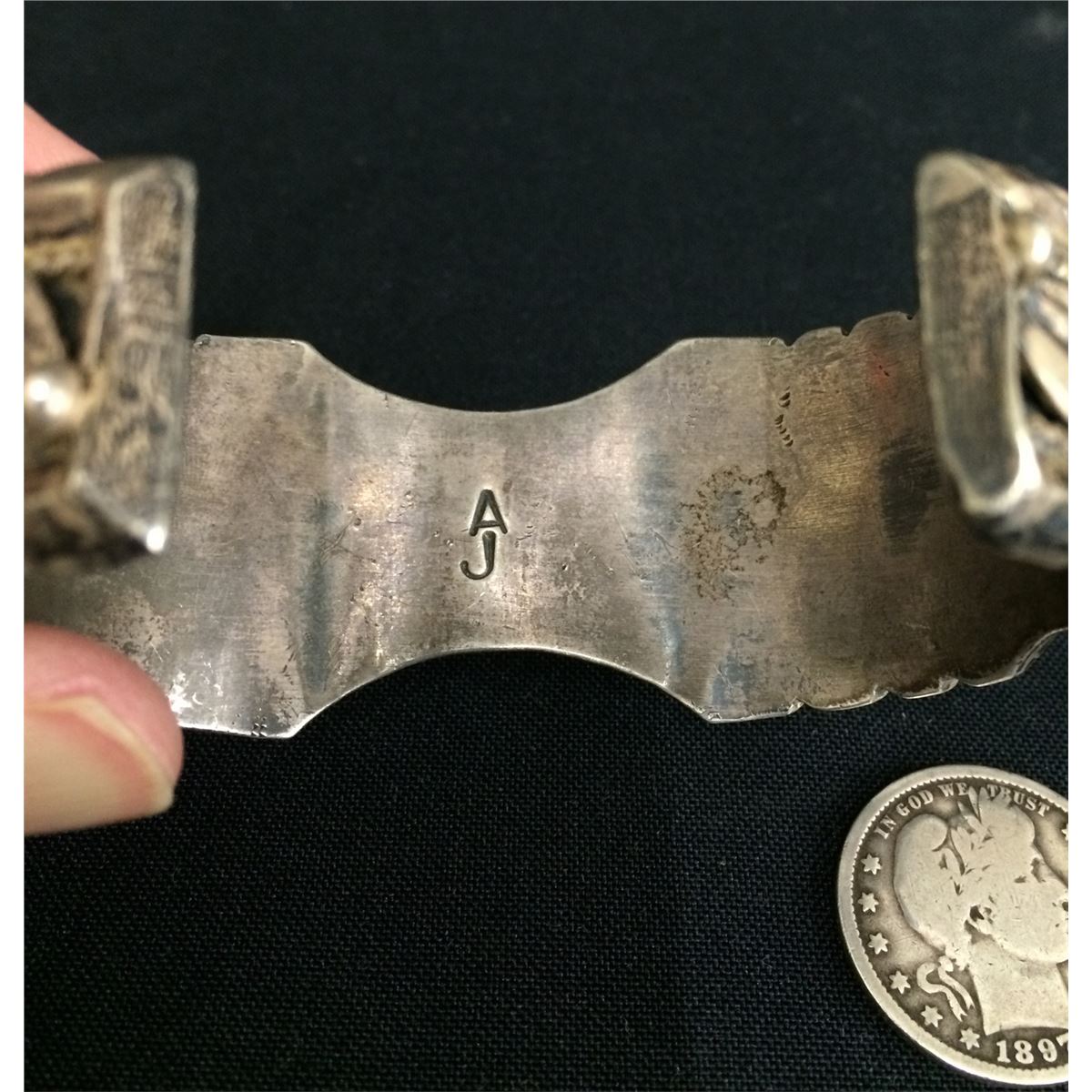 This vintage watch cuff measures approx. 5 3/4" inside circumference plus there is a 1.25" opening. It is 1.25" at the widest point and weighs approx. 77.7g. Stamped AJ