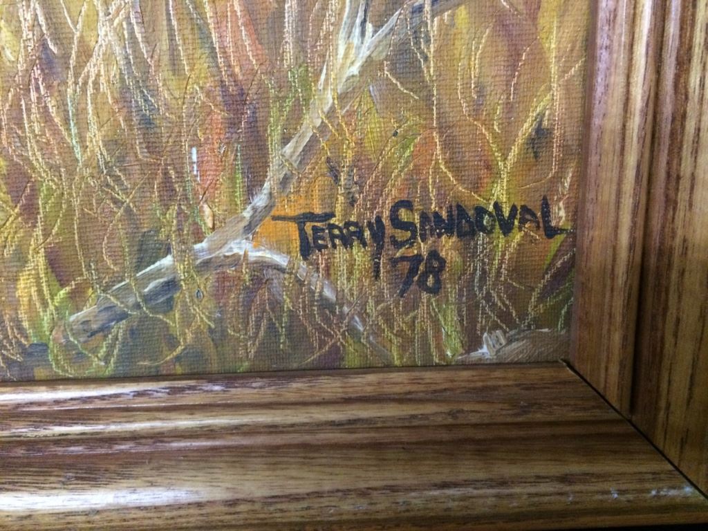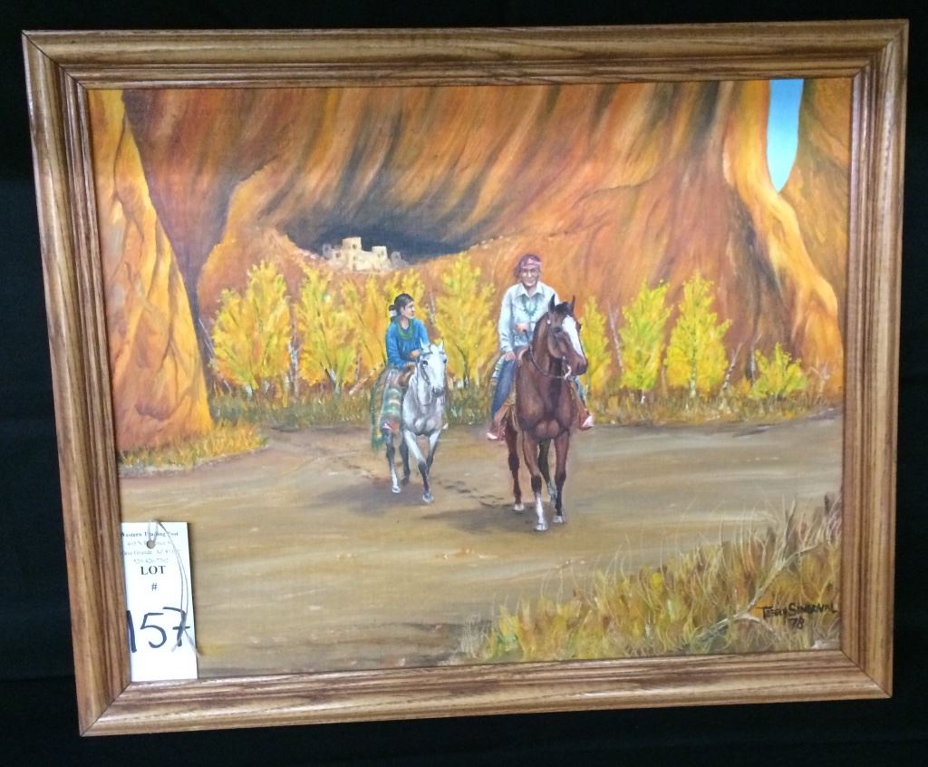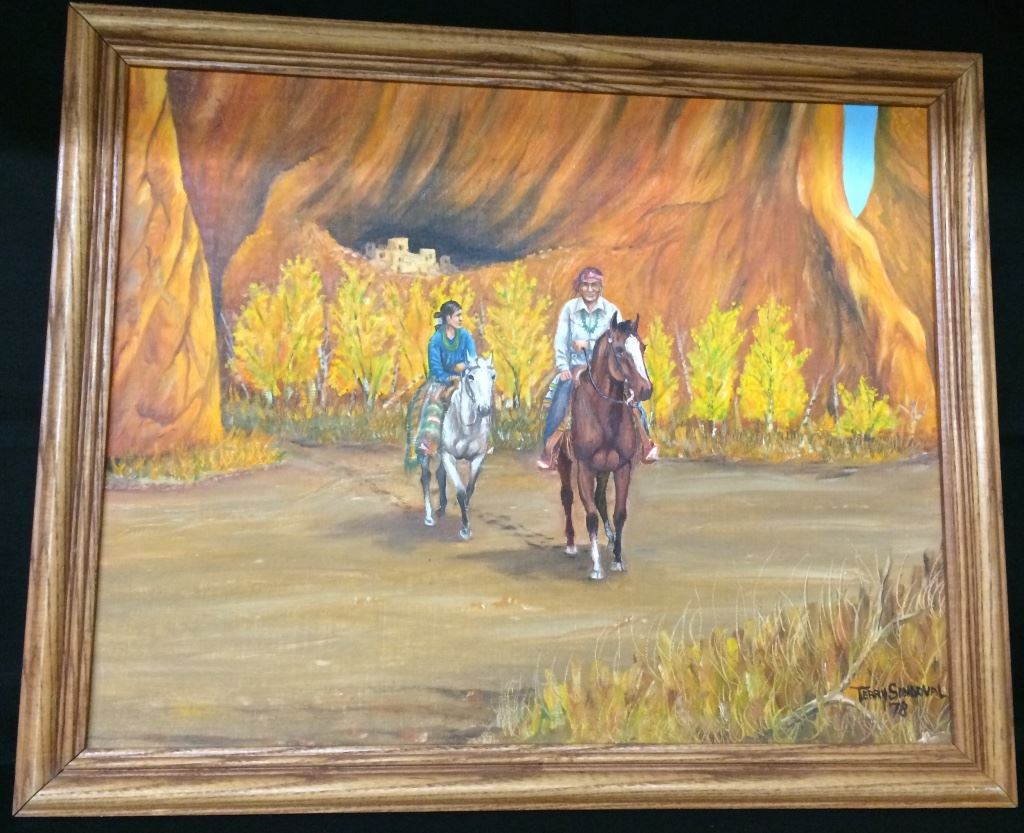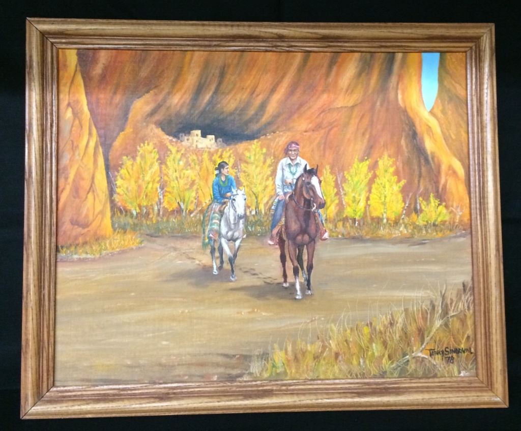 This original, one-of-a-kind oil on canvas board is signed Terry Sandoval (Navajo) 1978. Titled, “Heading for the Trading Post” it measures 22” X 18” with frame. Good condition. Shipping: There will be a $5 handling / packaging fee for shipping this lot. The actual cost of postage will be added on top of that.