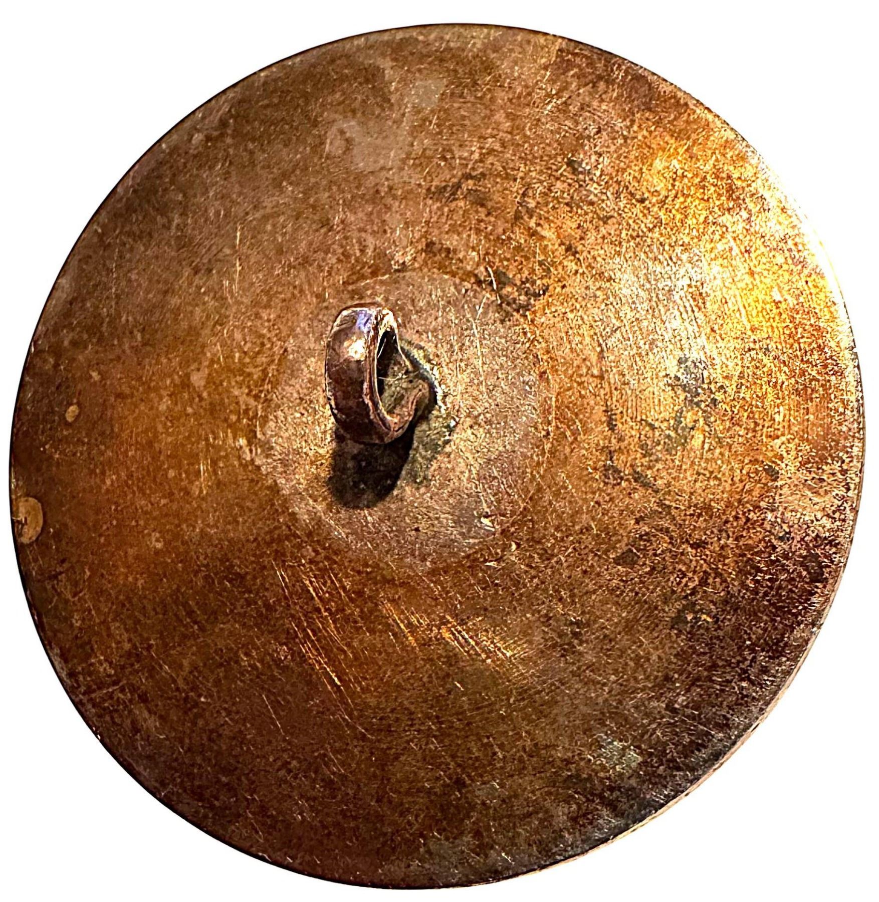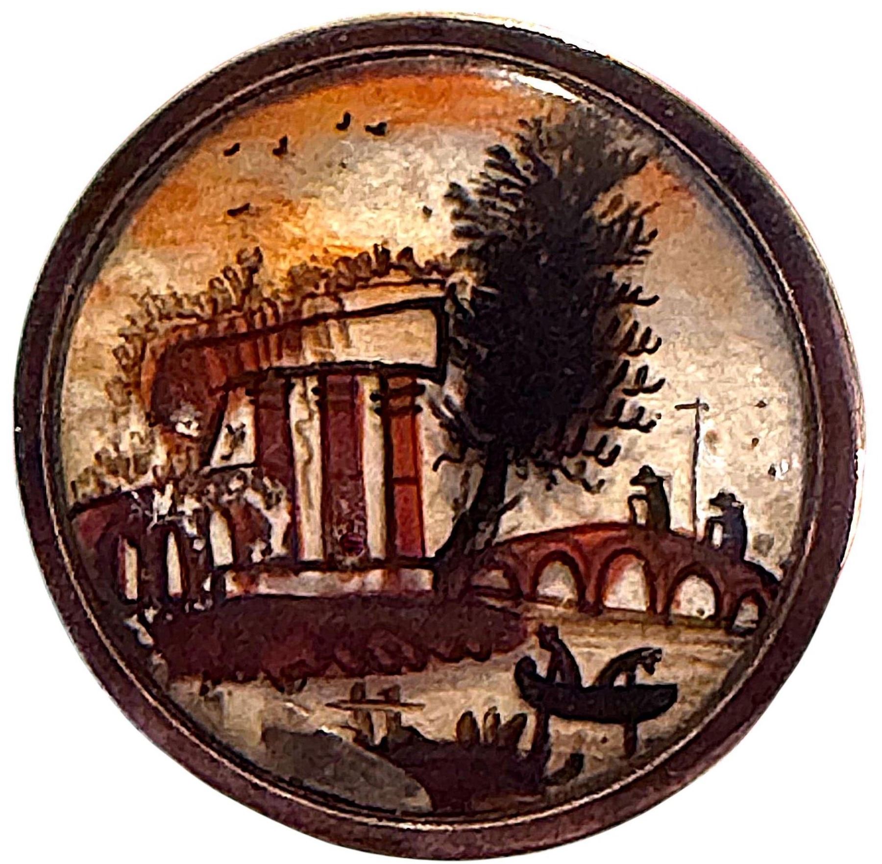 1 Large 18th C. Reverse painted scene set in copper. This is another incredible copper button from the collection of Harry Case of Missouri. The center glass is reverse painted with a very detailed architectural scene in very warm colors. Notice the detail of those walking across the bridge and the people in the boat on the water, nt to mention all the other detail in the button. This was certainly hand crafted by a talented artist in the 18th century. The white background seen is believed to be a thin sheet of Mica and the base is a beautiful and high quality copper mounting. Examples like this do not come up for sale often.