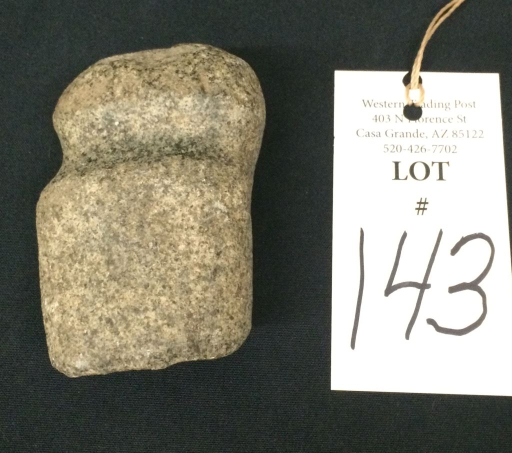 This prehistoric axehead (almost a mini) came from the old Frontier Relics Museum (Orville Mickens estate). Mr. Mickens found most of the items in his museum while tromping around historical areas in Arizona and New Mexico. Measures just under 4” long. Shipping: There will be a $5 handling / packaging fee for shipping this lot. The actual cost of postage will be added on top of that.