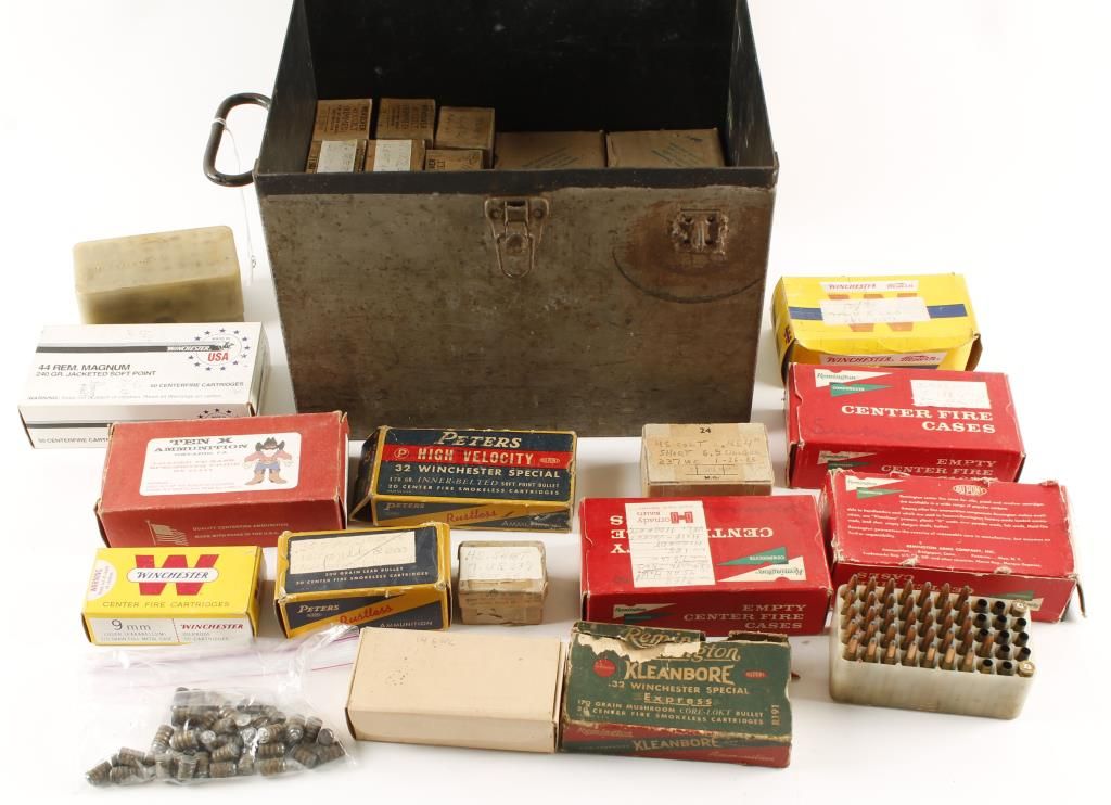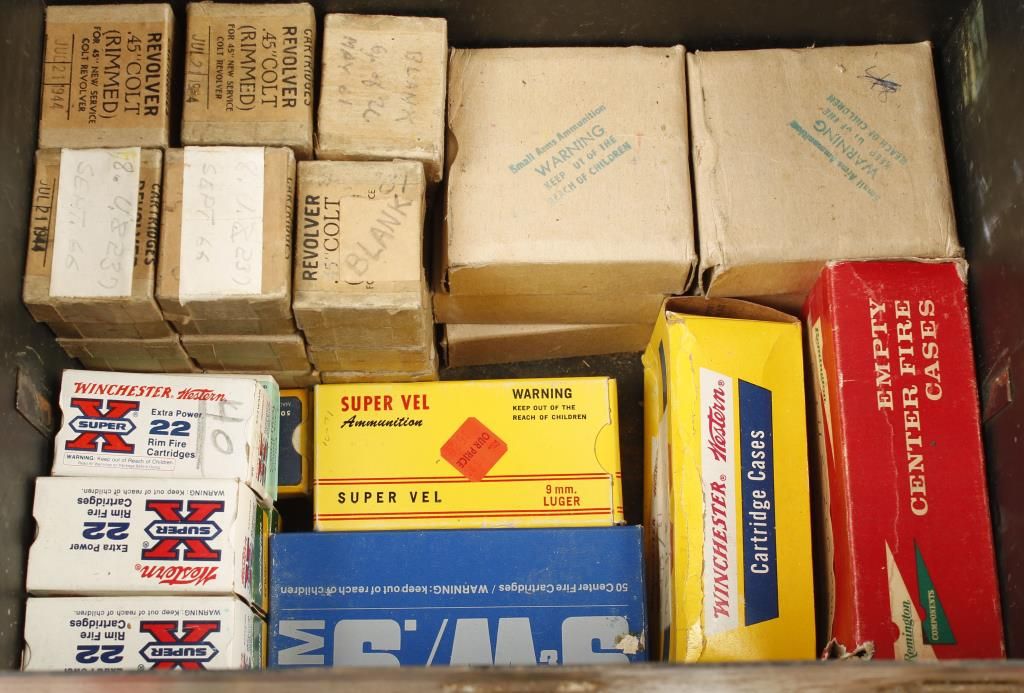 169 rounds of .45 Colt. 12 rounds of .455. 12 rounds of .45 Colt Short blanks. 35 rounds of .45 Colt Short. 50 rounds of .25 ACP. 191 rounds of .22WRF. A small box of .308 150Gr bullets. 125 rounds of .22WMR. 34 rounds of .357 Magnum reloads. 492 rounds of 9mm Luger. 55 rounds of .222 Remington and 46 spent cases. 150 .44 Special reloads. 87 .44 Magnum spent cases. 139 rounds of .45 Auto Rim reloads. 2 empty boxes for Winchester .32 Special cartridges. 1464 loaded rounds in total. 40 cast wadcutter bullets.