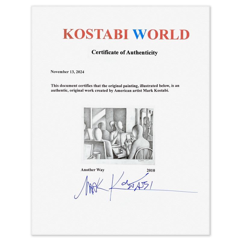 "Another Way" is an original drawing on paper by Mark Kostabi, hand signed by the artist. This piece comes custom framed. Includes Certificate of Authenticity. Measures approx. 18" x 20.5" (frame), 12" x 14.5" (image). This item requires special handling and may have a longer than usual turnaround.