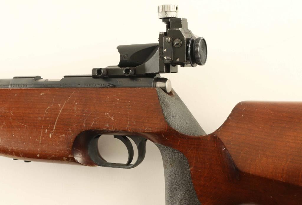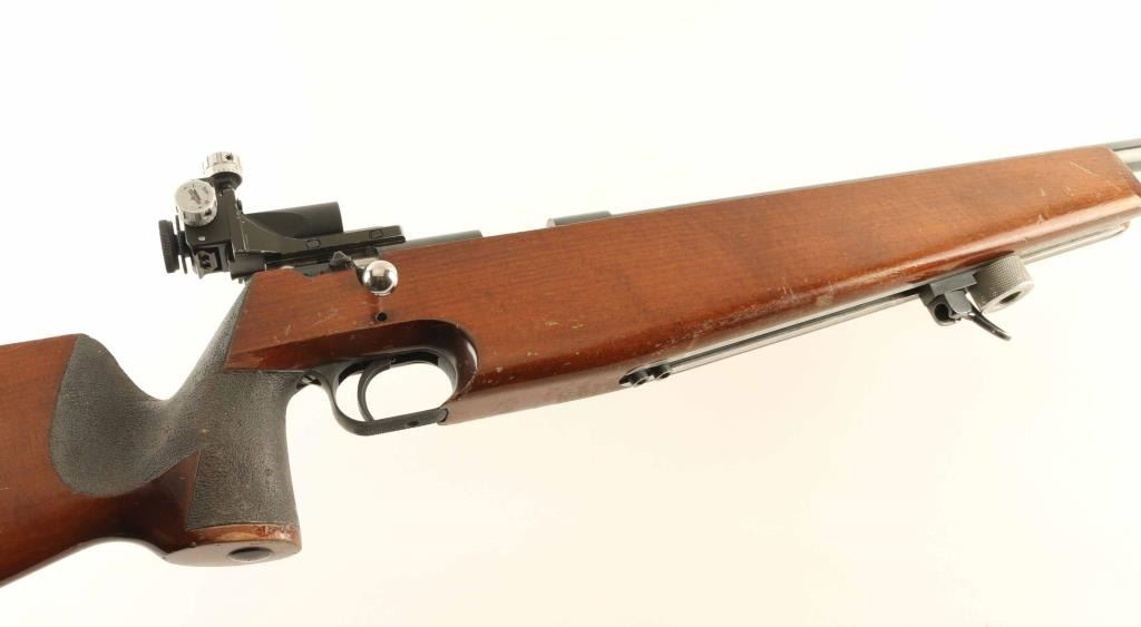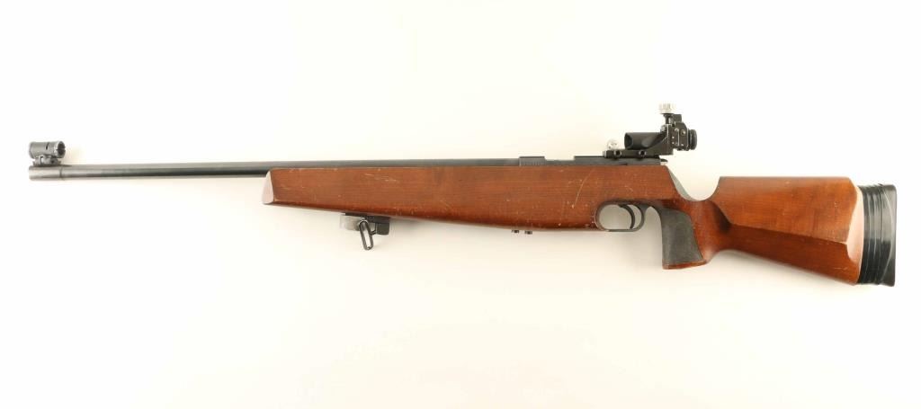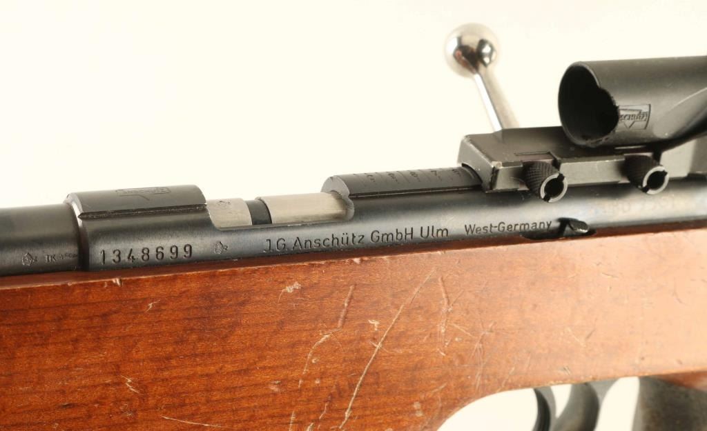 Rifle. Bolt-Action. "Match 64". Some of these were used by the Canadian Military for training purposes. Made is West Germany. Single-shot. 25 3/4" heavy round barrel, with front globe, and adjustable Anschutz peep sight. There is a chip out of the rear sight hood. Deep pistol-grip, thumbhole stock with aluminum accessory rail. Hard rubber wrapped pistol grip, and extended hard rubber buttplate. Bore appears very good, but dirty, Action is smooth/tight. Someone has electropenciled some letters/numbers on the left side of the receiver. Wood is good with numerous scratches/dings, and some finish loss, nothing serious .This rifle was made after 1977 with a 2 letter code on the left side of the barrel (IK) NRA Condition-Good-Very Good. Modern Firearm.