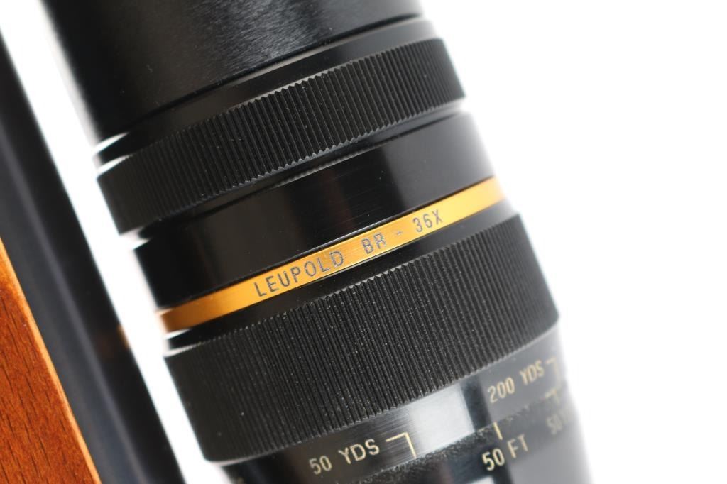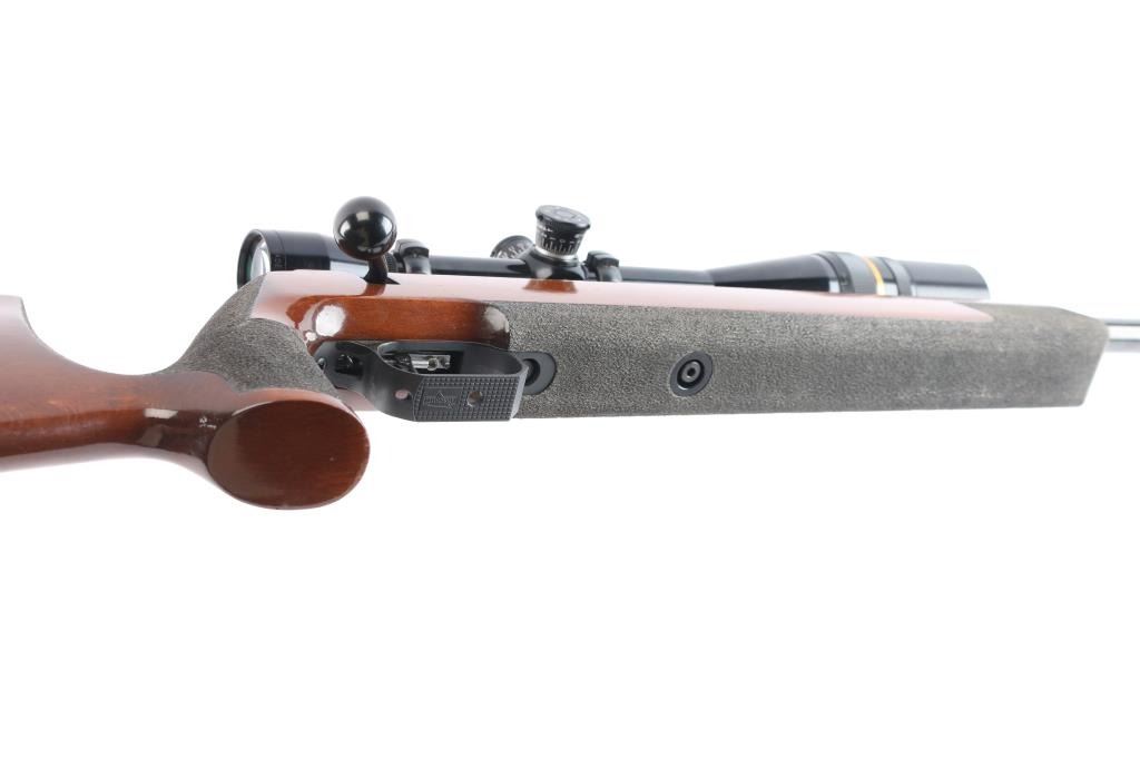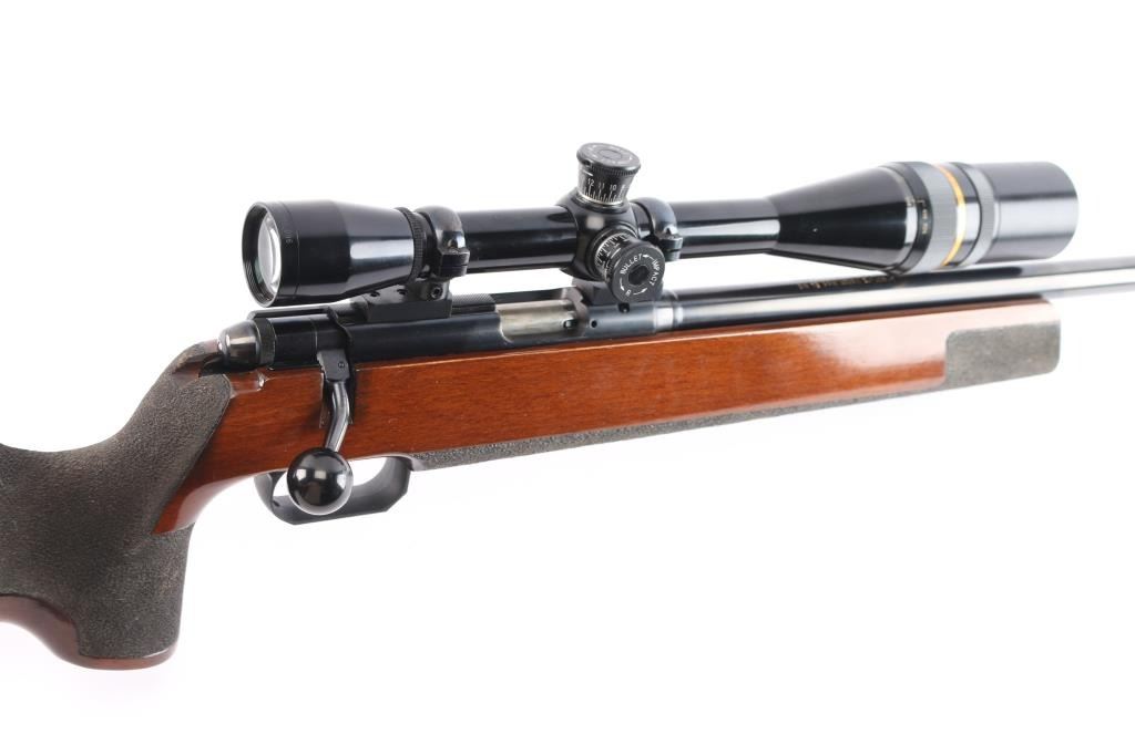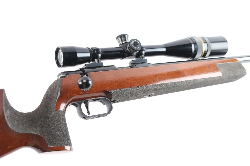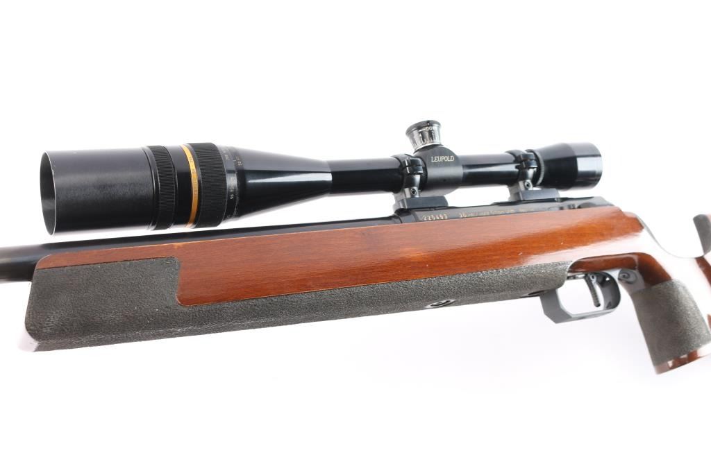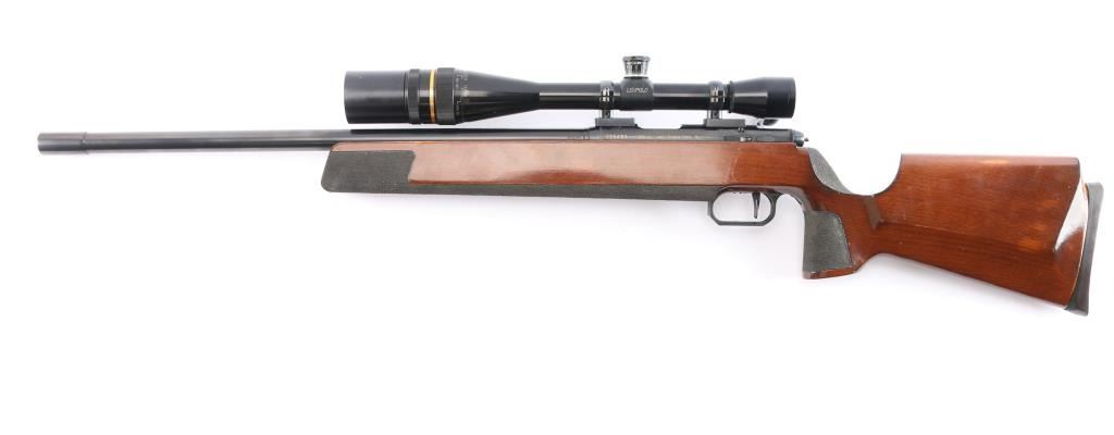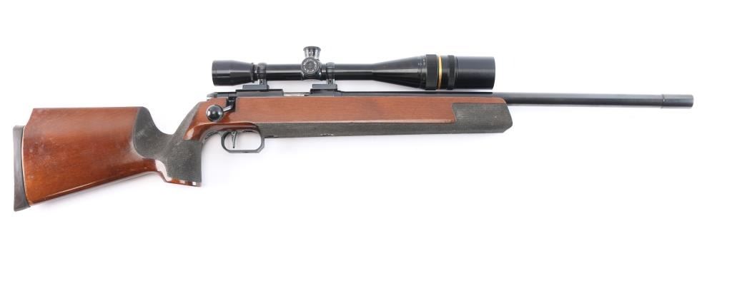 Anschutz Match Model 54 MS Bolt Action Single Shot Target Rifle with Scope. The MS means it was designed for metallic silhouette. High quality bolt action single shot match rifle chambered in .22 Long Rifle, receiver marked "West Germany". Barrel has the date code "IG"-1986, 22" heavy barrel with recessed crown, no provisions for sights, blue finish, manual thumb safety, fully adjustable two-stage trigger, swept back bolt handle. Mounted on a stippled walnut pistol grip stock with a solid recoil pad, high comb and cheek rest, accessory rail in forearm with Anschutz palm rest installed. Mounted with a Leupold BR-36X scope, sunshade, fine crosshair reticle, clear optics. Bore is excellent/bright, blue is about 98% with marking highlighted in gold, stock is very good/sound with some minor scratches/dings and a little handling/edge wear. NOTE* When the action is worked it does not cock. Needs adjustment/repair.