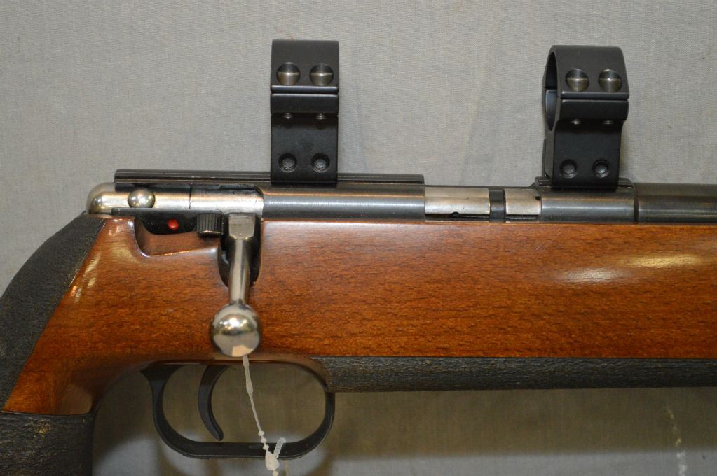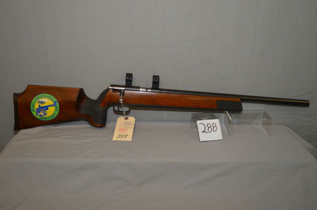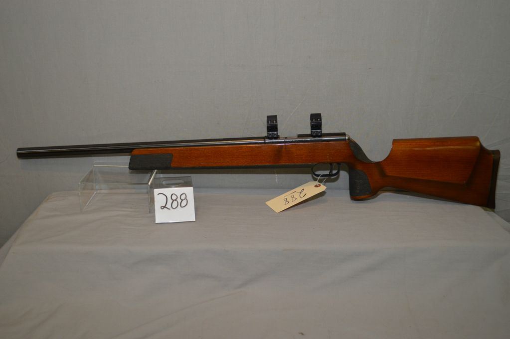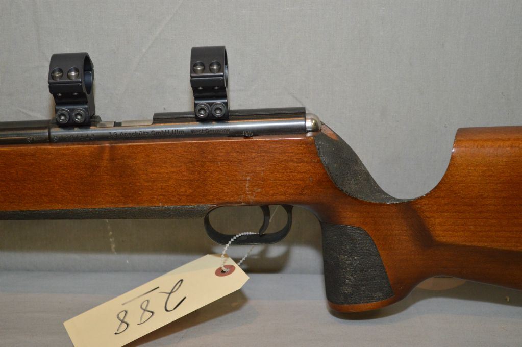 Anschutz Model 84 Silhouette .22 LR Cal Single Shot Bolt Action Rifle w/ 21 1/2" heavy bbl [ blue finish, no sights, fitted w/ rings inside of grooved receiver, right handed target stock, w/ high comb and raised cheek pce, recoil pad, swollen pistol grip, appears v-good over all ] Ser # 1194543