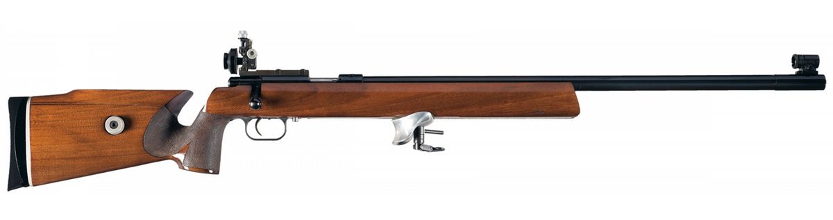 Manufactured circa 1975. Front globe sight and fully adjustable rear peep sight on a quick detachable mount. The barrel is drilled and tapped for scope blocks in two locations and the adjustable trigger is extremely light. Mounted on a walnut pistol grip stock with textured pistol grip area, forend accessory rail with aluminum hand stop/sling swivel, adjustable comb and adjustable buttplate.