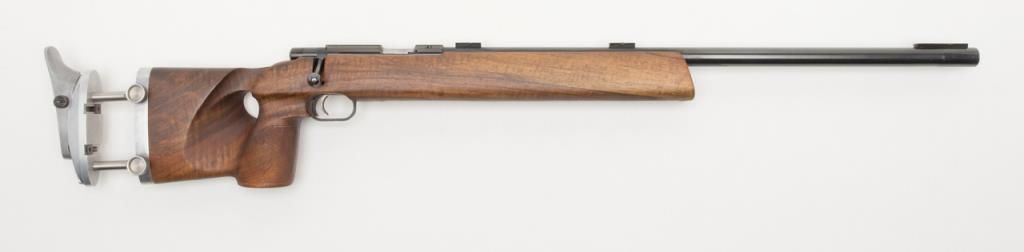 Anschutz-Modell Match 54 bolt action rifle, .22 caliber, Serial 53638. The rifle is overall very good condition with a 27” bull barrel. The barrel and action retain nearly all of their blued finish with target bases in three locations. Theexaggerated smooth wood target stocks are in very good condition showing only minor handling marks, with pistol grip and fully adjustable target butt. The bore is very good, the action crisp and markings sharp on this quality target rifle.(modern/PPT). Est.: $750-$1,500.