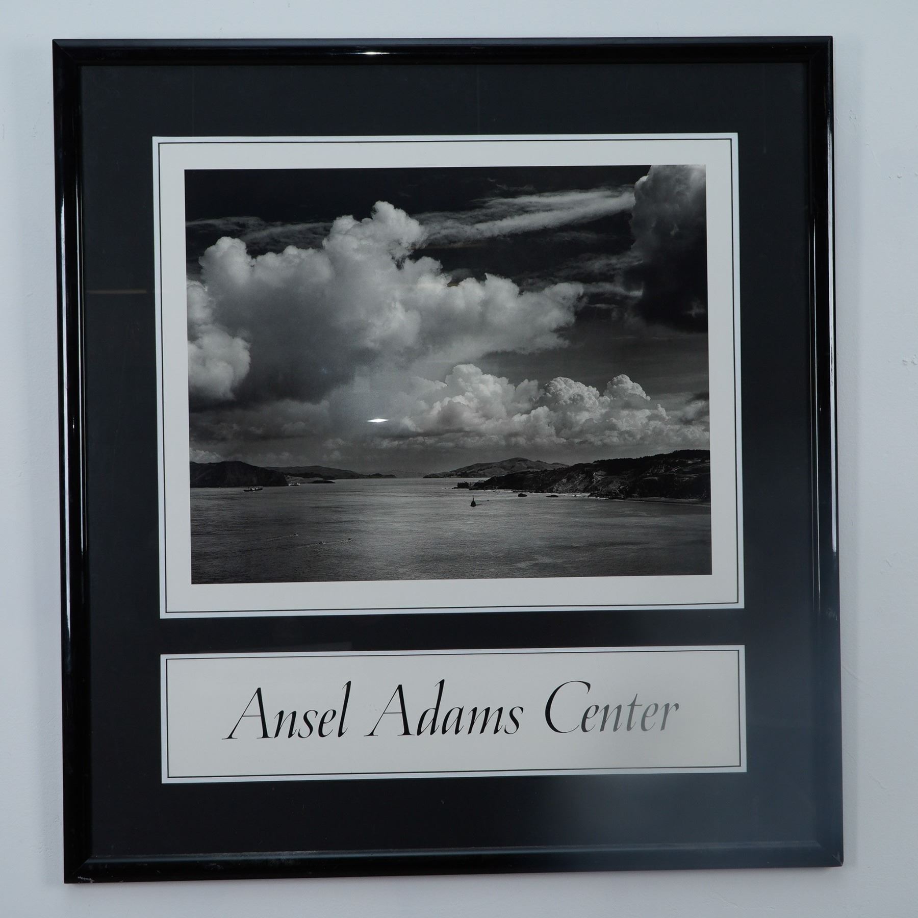 This framed Ansel Adams Center poster print features one of Ansel Adams' iconic black-and-white landscape photographs, capturing a breathtaking view of nature with his signature mastery of light and composition. The print is professionally framed under glass in a black frame with a black mat, featuring the "Ansel Adams Center" title beneath the image. A striking piece for collectors of fine art photography, nature lovers, or admirers of Adams' legendary work.