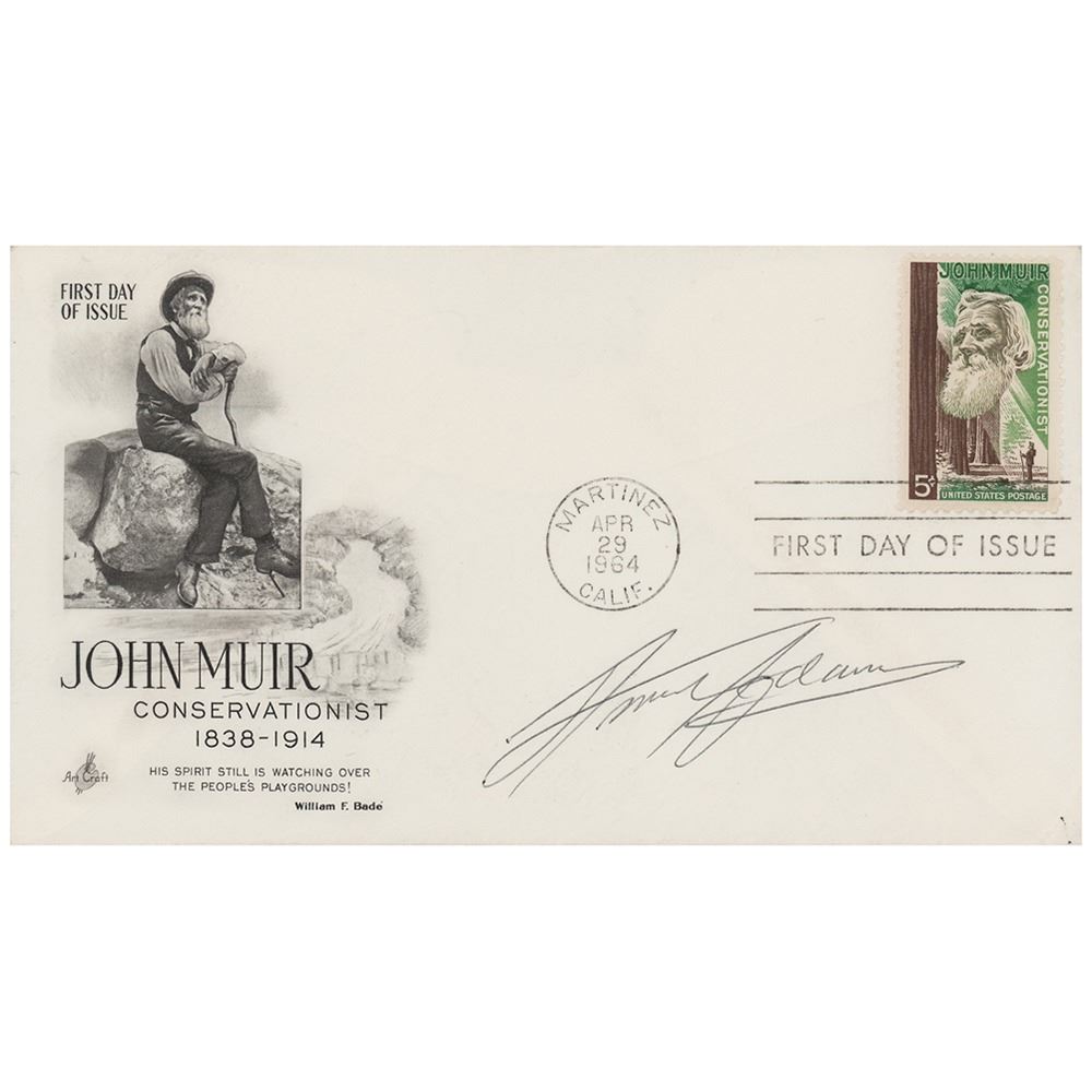 Appealing FDC with a cachet honoring the life of revered conservationist John Muir, postmarked in Martinez, California, on April 29, 1964, signed in black ballpoint by Ansel Adams. In fine condition.