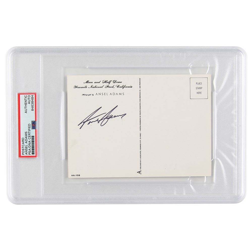 Semi-glossy 4.25 x 6 postcard photo of ‘Moon and Half Dome’ in Yosemite National Park, signed on the reverse in black felt tip by the photographer, Ansel Adams. In fine condition. Encapsulated in a PSA/DNA authentication holder.