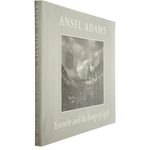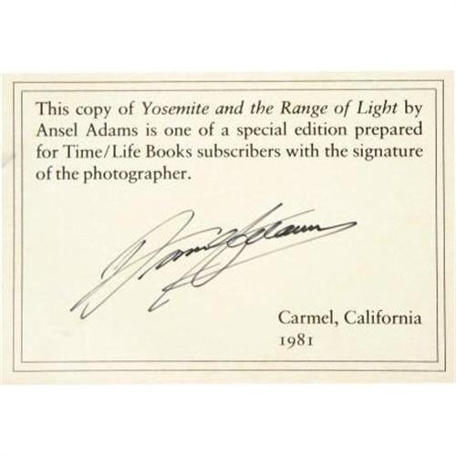 <B>Ansel Adams: Signed </B></I><B><I>Yosemite and the Range of Light</B></I></B></I> (Boston: Little, Brown and Company, 1981), fourth printing, unpaginated, heavily illustrated, red-and-blue-cloth binding with gold lettering, folio (12.25” x 15”), dust jacket (in protective cover). This stunning folio of the black-and-white Yosemite photographs of Ansel Adams (1902-1984) includes a foreword by Adams and an introduction by conservationist Paul Brooks. A bookplate signed <I>“Ansel Adams”</B></I> with the printed date 1981 is attached to the front endpaper. The book is in fine condition; the dust jacket is very good with some wear and a clipped corner on the front interior flap.<BR><BR><b>Shipping:</b> Books & Catalogs (<a target="_blank" href="http://www.heritageauctions.com/common/shipping.php">view shipping information</a>)