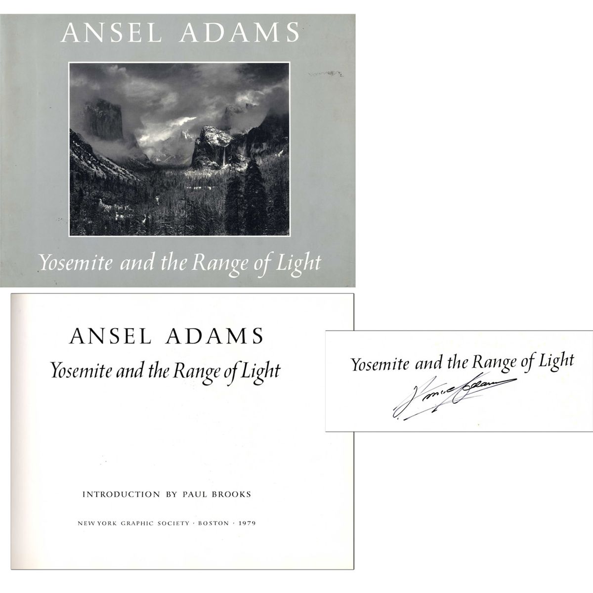 Ansel Adams signed first edition, first printing of ''Yosemite and the Range of Light.'' New York Graphic Society: Boston: 1979. Boldly signed ''Ansel Adams'' to half title page. Hardcover with gilt lettering on backstrip, accompanied by unclipped dustjacket, measures 15.25'' x 12.25'' and runs 145pp. Volume features 116 truly light filled black and white images of Yosemite. Book and dustjacket both in near fine condition.
