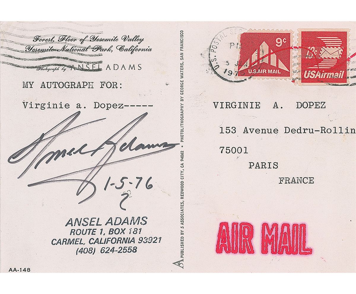 Two items: first, a serene 6 x 4.25 postcard photo entitled ‘Forest, Floor of Yosemite,’ signed on the reverse in black felt tip, “Ansel Adams 1-5-76,” beneath a typed inscription. Second, an ink signature, “Most Obedient and very Humble Servant, Chas. W. Peale,” on an off-white 2.75 x 2 slip clipped from the close of a letter. Double-matted and framed with an engraving of Peale to an overall size of 9.5 x 14. In overall fine condition.