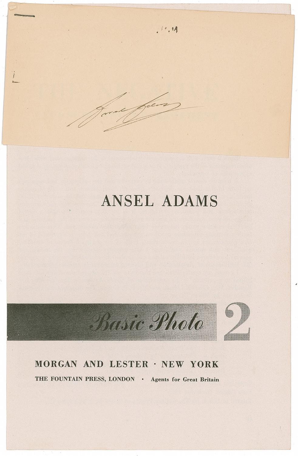 Ink signature, “Ansel Adams,” on an off-white 5.75 x 3 slip. Slip is stapled to a larger book page. In fine condition, with uniform light toning and a few stray marks.