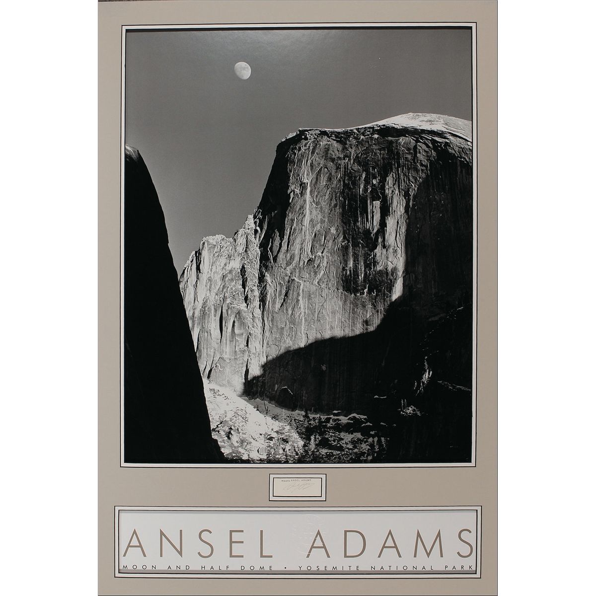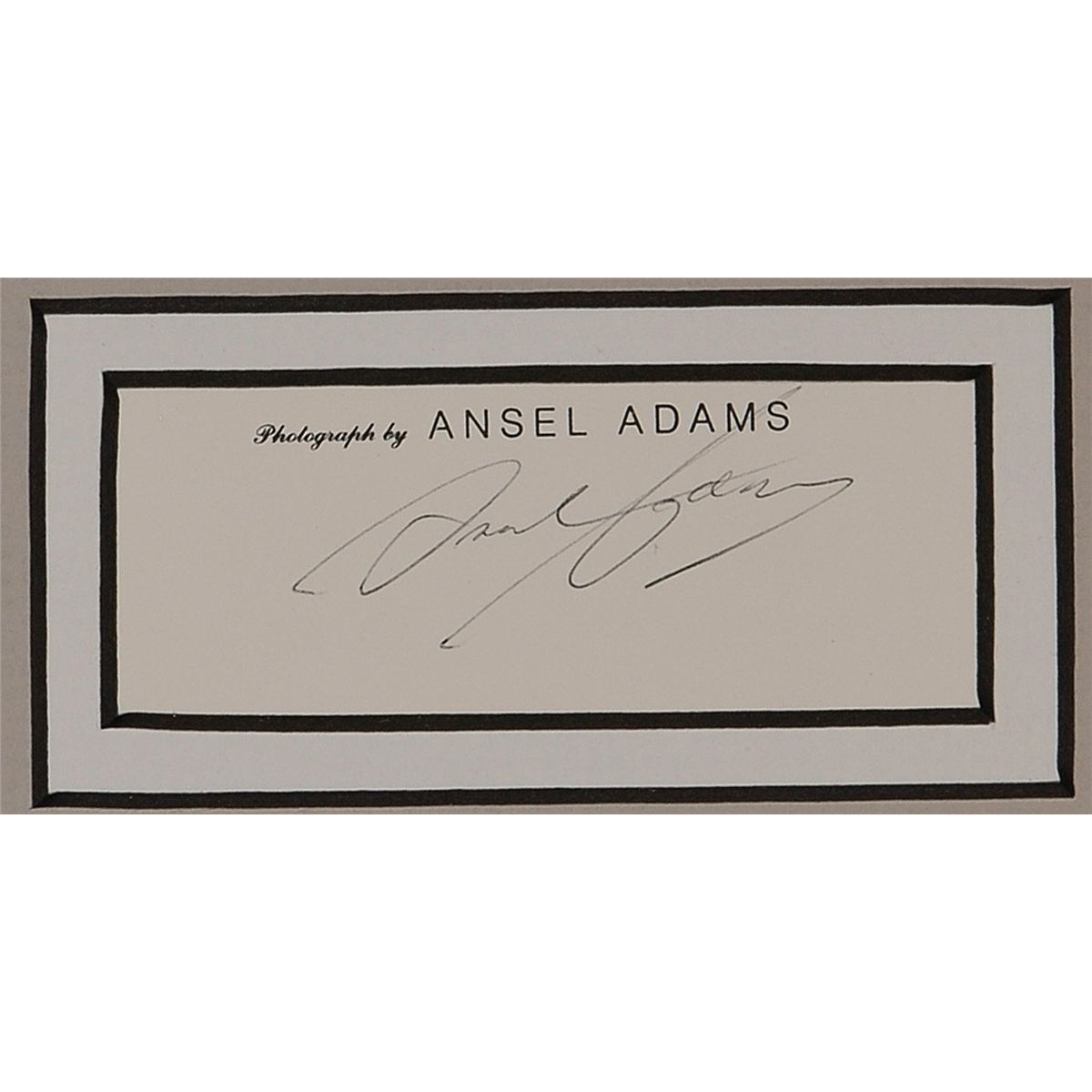 Ink signature, “Ansel Adams,” on an off-white 2.75 x 1 card. Impressively double matted with a print of Adams’s ‘Moon and Half Dome’ to an overall size of 24 x 36. In fine condition. Oversized.