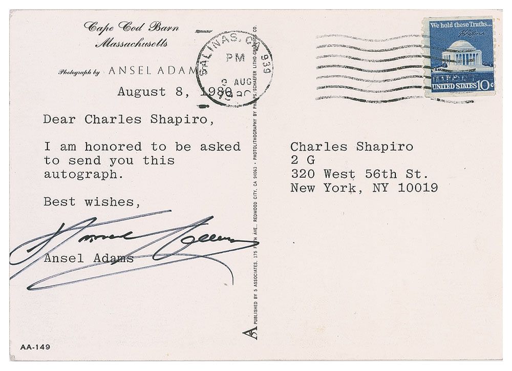 TLS on a postcard featuring Adams’ photo, ‘Cape Cod Barn, Massachusetts,’ 6 x 4. Ansel writes a brief letter to an admirer, in full: “I am honored to be asked to send you this autograph,” beautifully signed at the conclusion in black felt tip. In fine condition.