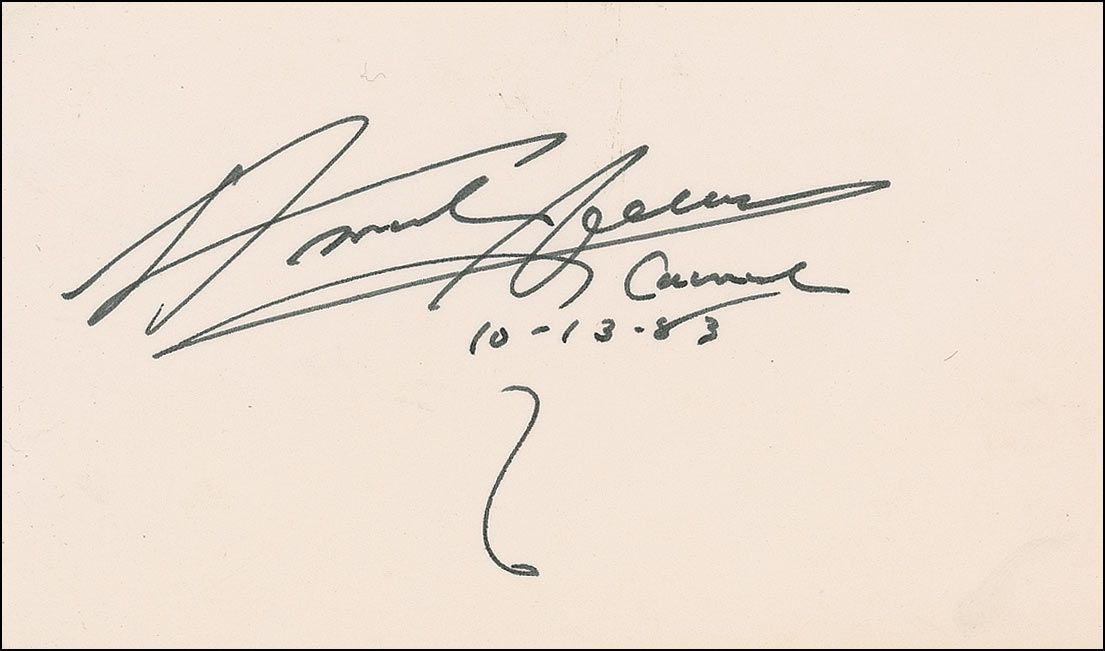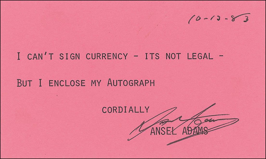 Two items: TNS on a pink 5 x 3 card, October 13, 1983. In full: “I can’t sign currency—Its not legal—But I enclose my autograph.”; and a felt tip signature, “Ansel Adams, Carmel, 10-13-83,” on an off-white 5 x 3 card. In fine condition.