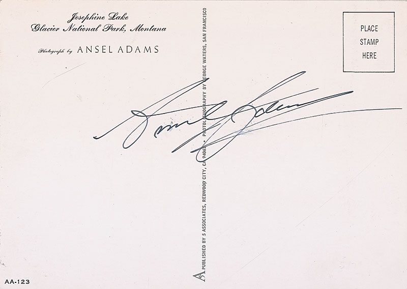 Breathtaking 6 x 4.25 postcard photo of Josephine Lake in Glacier National Park, signed on the reverse in black ink. In fine condition, with a couple trivial brushes to the signature.