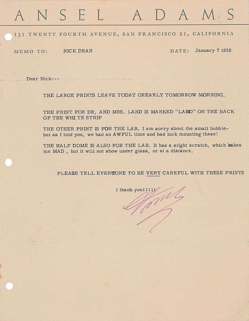 TLS, one page, 8.5 x 11, personal letterhead, January 7, 1958. Letter to Nick Dean. In part: “The large prints leave today…The Half Dome is also for the lab. It has a slight scratch, which makes me mad, but it will not show under glass, or at a distance. Please tell everyone to be very careful with these prints.” Punch holes to left edge, a few wrinkles, and a uniform shade of mild toning, otherwise fine condition.