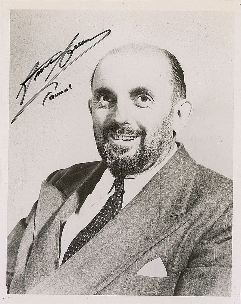 Uncommon glossy 8 x 10 portrait of Adams in a suit and tie, signed in black felt tip, “Ansel Adams, Carmel.” In fine condition, with scattered surface marks and creases.
