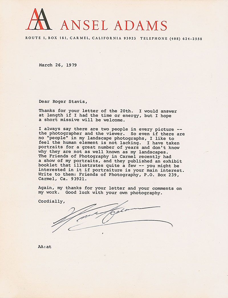 TLS, one page, 8.5 x 11, personal letterhead, March 26, 1979. Letter to Roger Stavis. In part: “I always say there are two people in every picture—the photographer and the viewer. So even if there are no ‘people’ in my landscape photographs, I like to feel the human element is not lacking. I have taken portraits for a great number of years and I do not know why they are not as well known as my landscapes.” In fine condition.