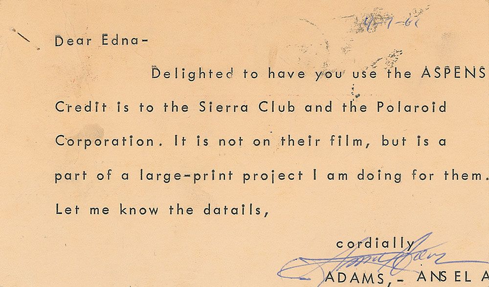 TLS signed “Ansel,” one page on a 5.5 x 3.25 government postcard, April 7, 1961. Letter to Edna Bennett. In part: “Delighted to have you use the Aspens[.] Credit is to the Sierra Club and the Polaroid Corporation. It is not on their film, but it is a part of a large-print project I am doing for them.” In fine condition, with some creasing to the upper left corner.