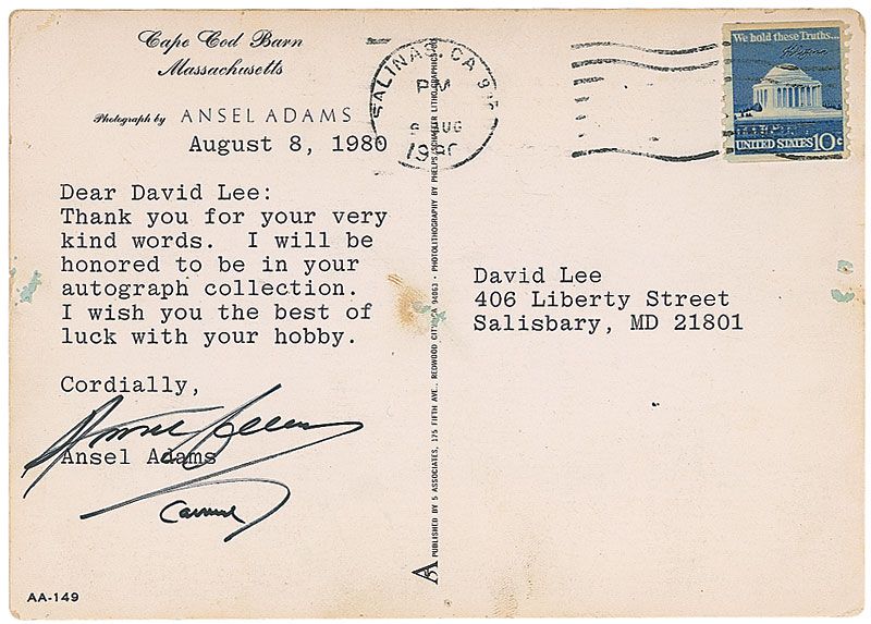 TLS signed “Ansel Adams, Carmel,” on a 6 x 4.25 photo postcard of Adams’s portrait entitled ‘Cape Cod Barn,’ August 8, 1980. Brief letter to a gentleman in Maryland. In full: “Thank you for your very kind words. I will be honored to be in your autograph collection. I wish you the best of luck with your hobby.” In fine condition, with some scattered light toning and soiling.