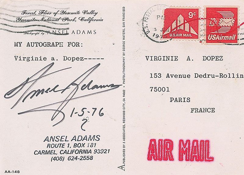 Serene 6 x 4.25 postcard photo entitled ‘Forest, Floor of Yosemite,’ signed on the reverse in black felt tip, “Ansel Adams 1-5-76,” beneath a typed inscription. In fine condition, with a postmark and cancellation along top edge.