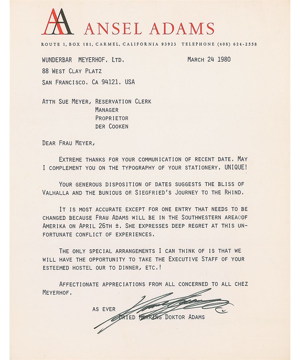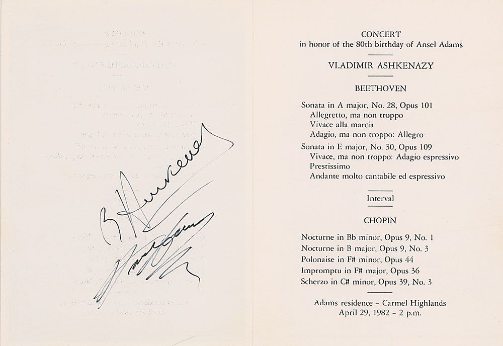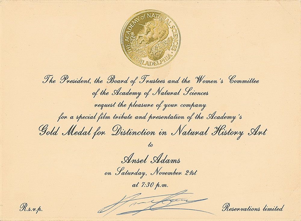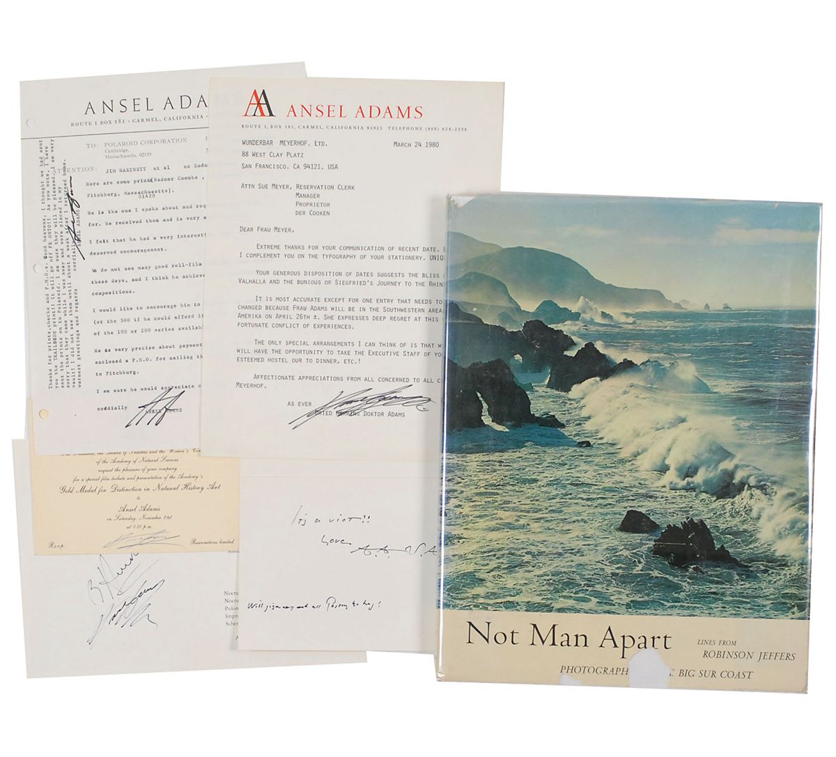 Collection of six items signed by Adams consisting of: a hardcover edition of Not Man Apart, signed by Adams and contributors David Brower and Steve Crouch; a 1982 program for a concert in honor of Adams’s 80th birthday, also signed by pianist Vladimir Ashkenazy; two one-page TLSs; an Academy of Natural Sciences Invitation for the presentation of the academy’s Gold Medal for Distinction to Adams; and a greeting card signed “A. A.” In very good to fine overall condition.