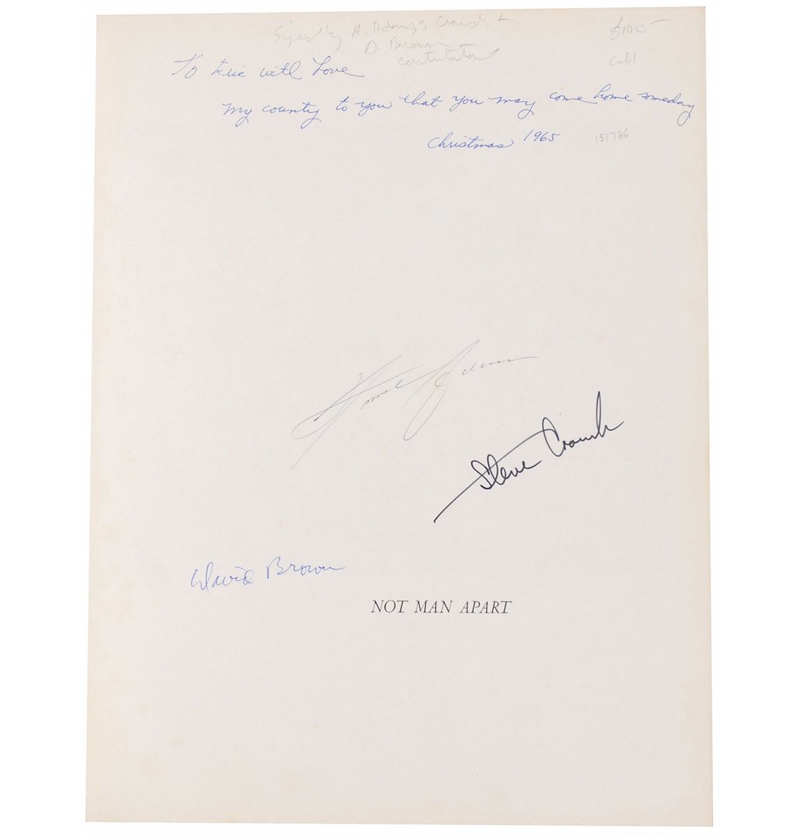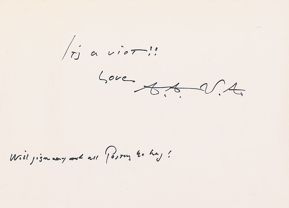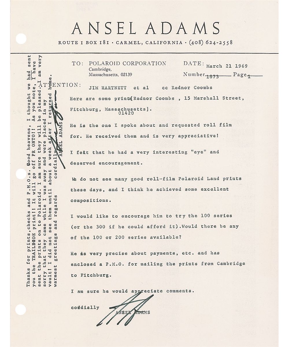 Collection of six items signed by Adams consisting of: a hardcover edition of Not Man Apart, signed by Adams and contributors David Brower and Steve Crouch; a 1982 program for a concert in honor of Adams’s 80th birthday, also signed by pianist Vladimir Ashkenazy; two one-page TLSs; an Academy of Natural Sciences Invitation for the presentation of the academy’s Gold Medal for Distinction to Adams; and a greeting card signed “A. A.” In very good to fine overall condition.