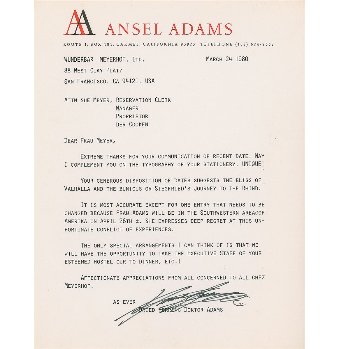 TLS, one page, 8.5 x 11, personal letterhead, March 24, 1980. Humorous letter to the wife of the CEO of Paul Masson Vineyards. In part: “Extreme thanks for your communication of recent date. May I complement you on the typography of your stationery. UNIQUE! Your generous disposition of dates suggests the bliss of Valhalla and the bunious [sic] of Siegfried’s Journey to the Rhind [sic, Rhine]. It is most accurate except for one entry that needs to be changed because Frau Adams will be in the Southwestern area of Amerika on April 26th. She expresses deep regret at this unfortunate conflict of experiences.” Adams has signed above the typed notation which reads, “Dried Herring Doktor Adams.” In fine condition.