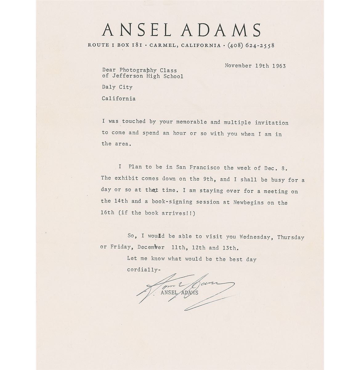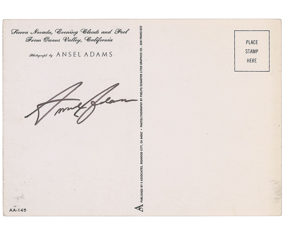 Two items: a postcard of Adams’s photograph entitled ‘Sierra Nevada, Evening Clouds and Pool from Owen’s Valley, California,’ 6 x 4.25, signed on the reverse in black felt tip; and a TLS, one page, 8.5 x 11, personal letterhead, November 19, 1963, in part: “I plan to be in San Francisco the week of Dec. 8. The exhibit comes down on the 9th.” In overall fine condition.
