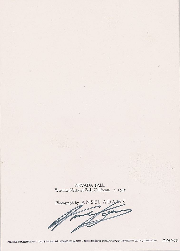 Attractive glossy greeting card with the front featuring an Ansel Adams photograph of Yosemite's Nevada Fall, measuring 5 x 7 closed, signed on the reverse in black felt tip. In fine condition.