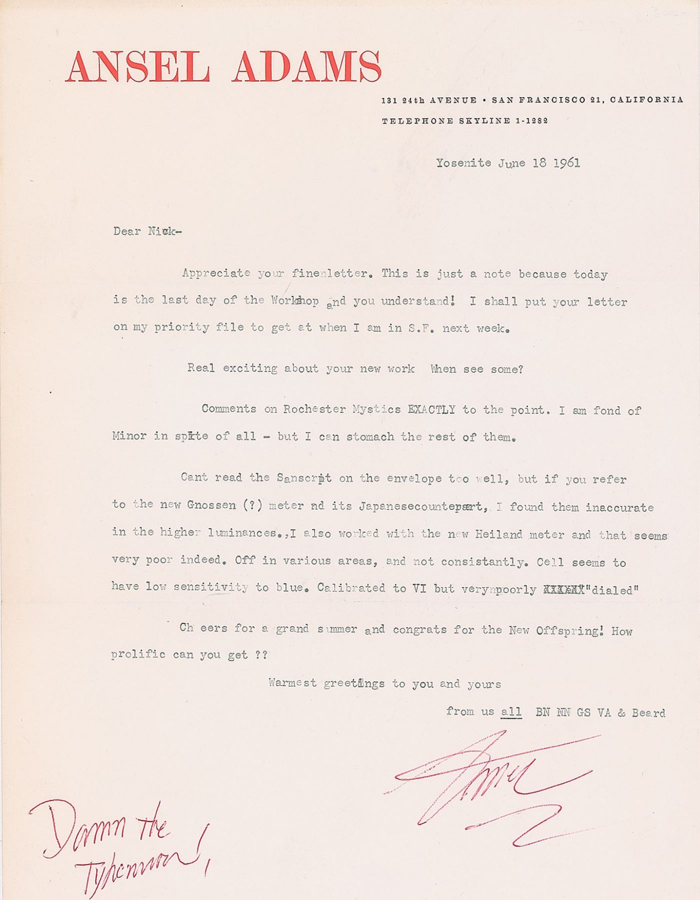 TLS signed “Ansel,” one page, 8.5 x 11, personal letterhead, June 18, 1961. Letter written from Yosemite, containing some discussion of photographic equipment. In part: "Appreciate your fine letter. This is just a note because today is the last day of the Workshop and you understand!…Real exciting about your new work. When see some? Comment on Rochester Mystics EXACTLY the point. I am fond of Minor in spite of all—but I can stomach the rest of them. Cant read the Sanscrit on the envelope too well, but if you refer to the new Gnossen (?) meter and its Japanese counterpart, I found them inaccurate in the higher luminances. I also worked with the new Heiland meter and that seems very poor indeed. Off in various areas, and not consistently. Cell seems to have low sensitivity to blue. Calibrated to VI but very poorly 'dialed.'" In fine condition.