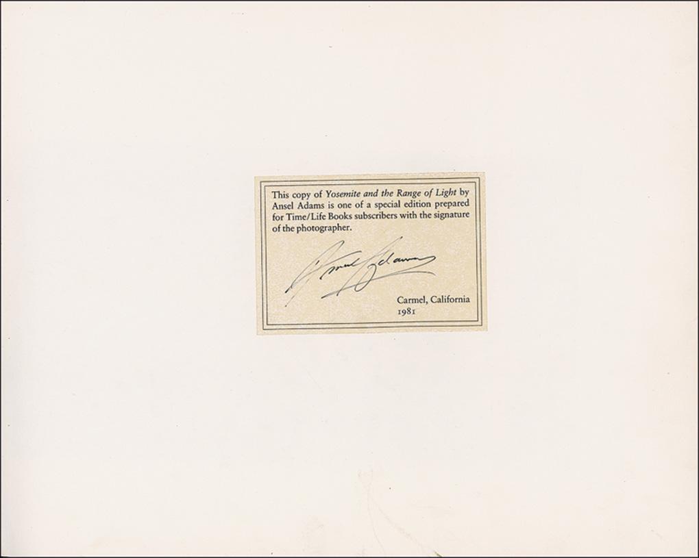 Signed book: Yosemite and the Range of Light. Later printing. Boston: New York Graphic Society, 1980. Hardcover with dustjacket, 15.25 x 12.25. Signed in black felt tip on a specially printed bookplate affixed to the front free end page. A bit of wear to jacket and some slight soiling to signed page, otherwise fine condition.