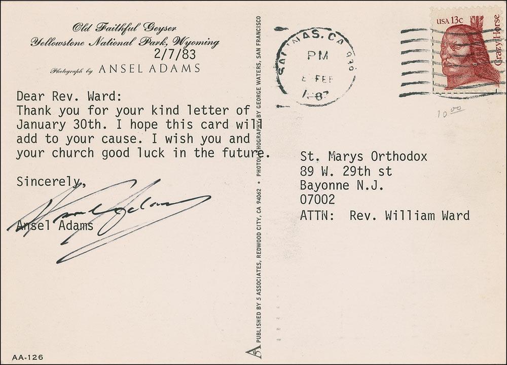 TLS, on a 6 x 4.25 postcard bearing an Adams’ image of Old Faithful, February 7, 1983. Short letter to a New Jersey priest. In part: “I hope this card will add to your cause. I wish you and your church good luck in the future.” In fine condition, with postal mark and cancellation to image side. RRAuction COA.