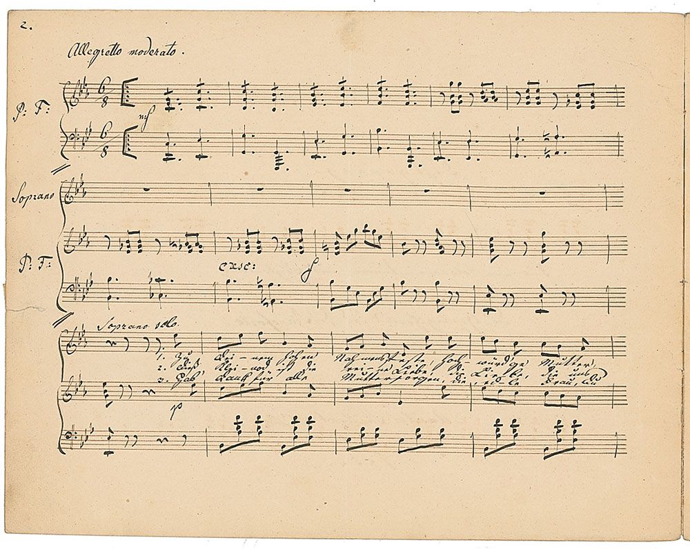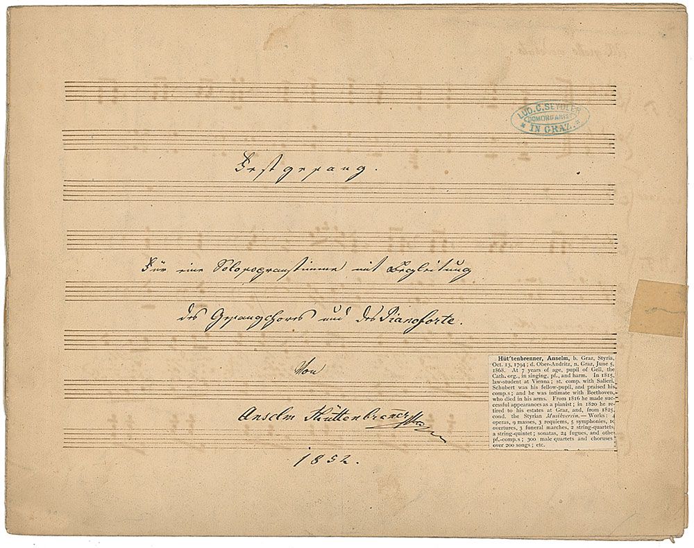 Austrian composer (1794–1868) who was friends with both Beethoven and Schubert. Handwritten musical manuscript, six musically-lined pages, 13 x 10, titled and signed on the front page in German (translated), “Festive Song. For a programmed solo voice, acc