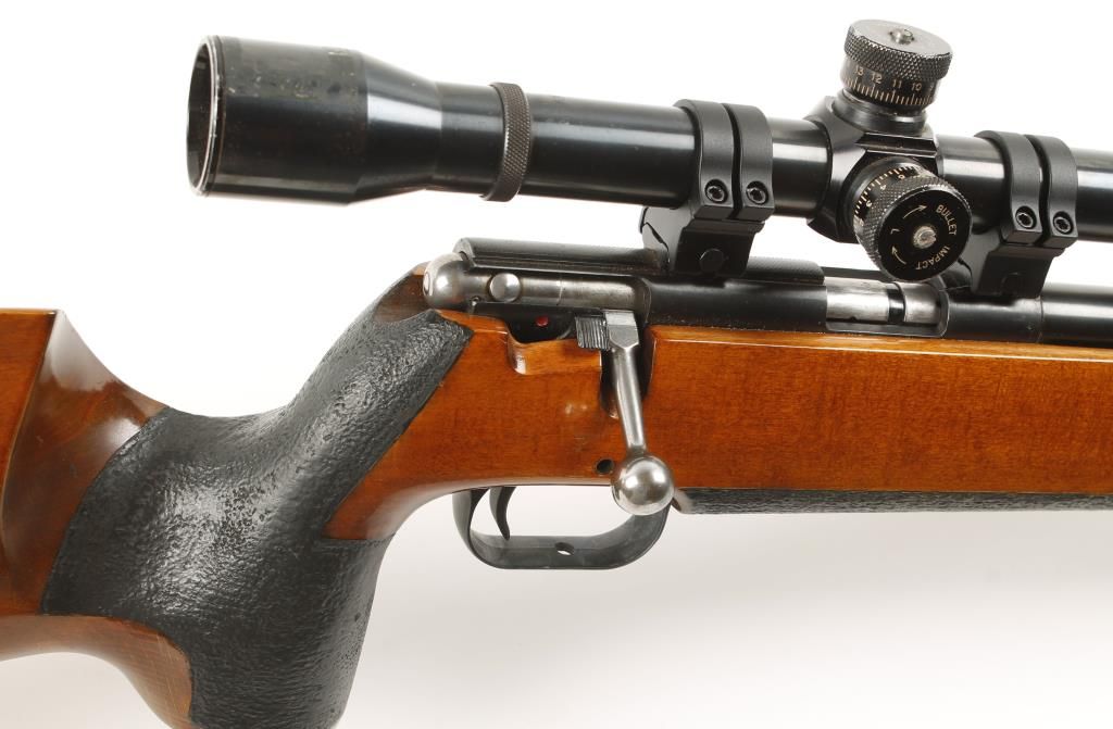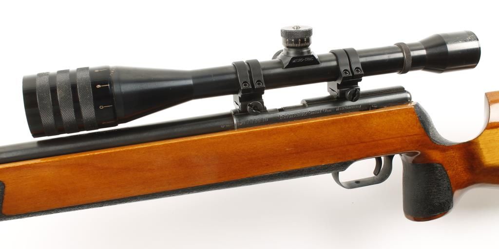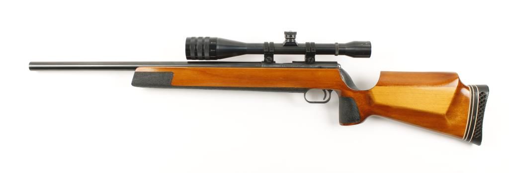 West German made silhouette model single shot bolt action rifle with 21-1/4" heavy barrel. Blued finish, target style walnut stock with stippled grip, no sights and fitted with Weaver T-16 scope. Very good bore and action. Condition: Very good showing light use. *Modern Firearm*