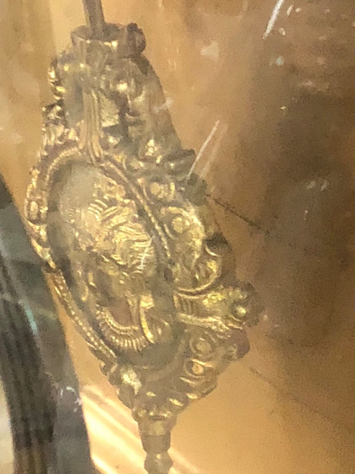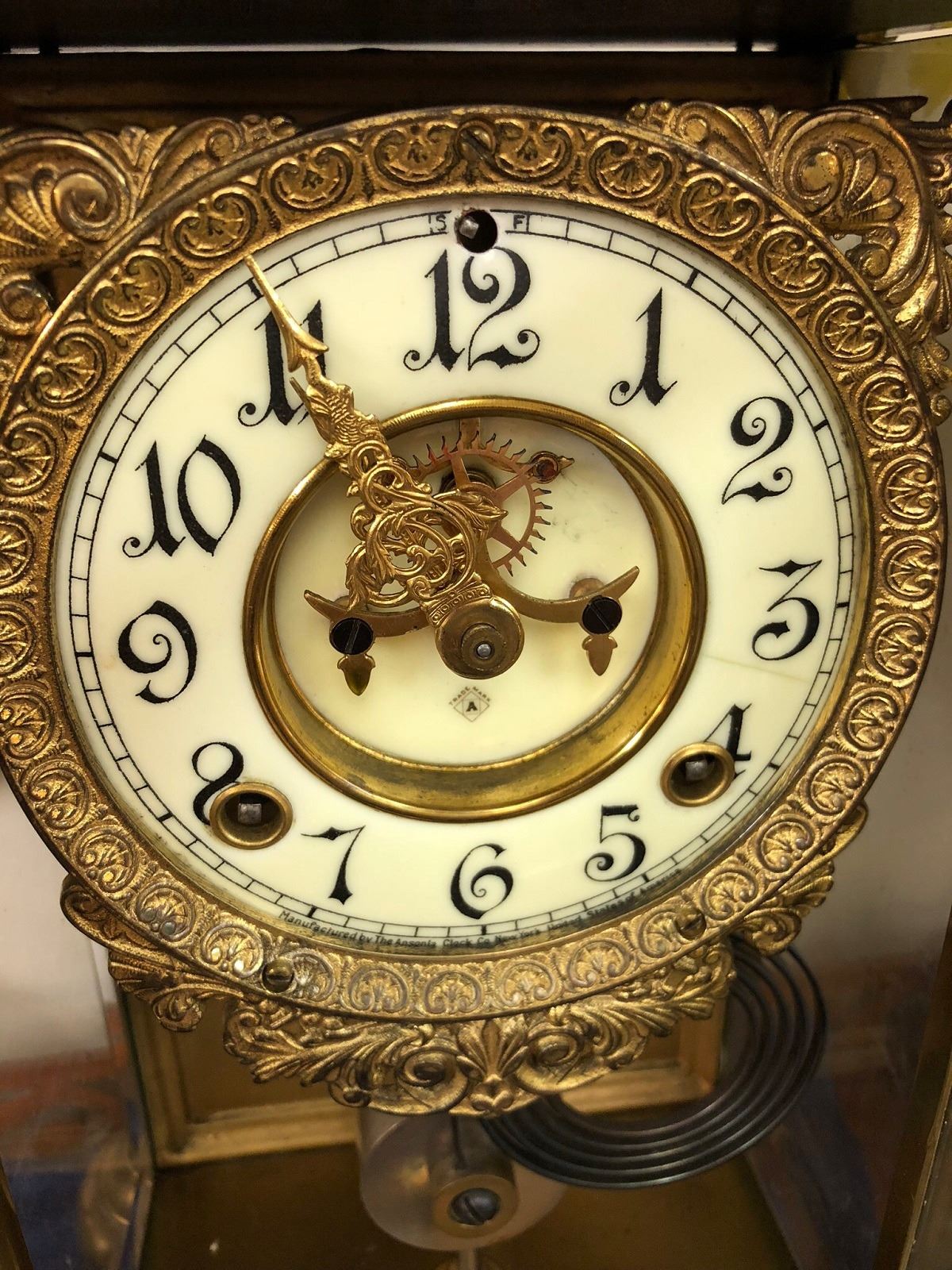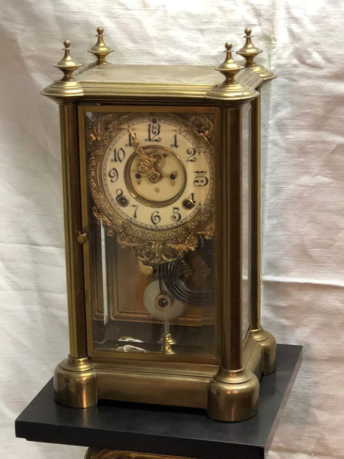 Ansonia Brass and Glass Crystal Regulator clock with finials and portrait pendulum in running condition. Beautiful clock, all glass is all there and all beautiful, pendulum is outstanding, 3 dimensional, and very ornate.