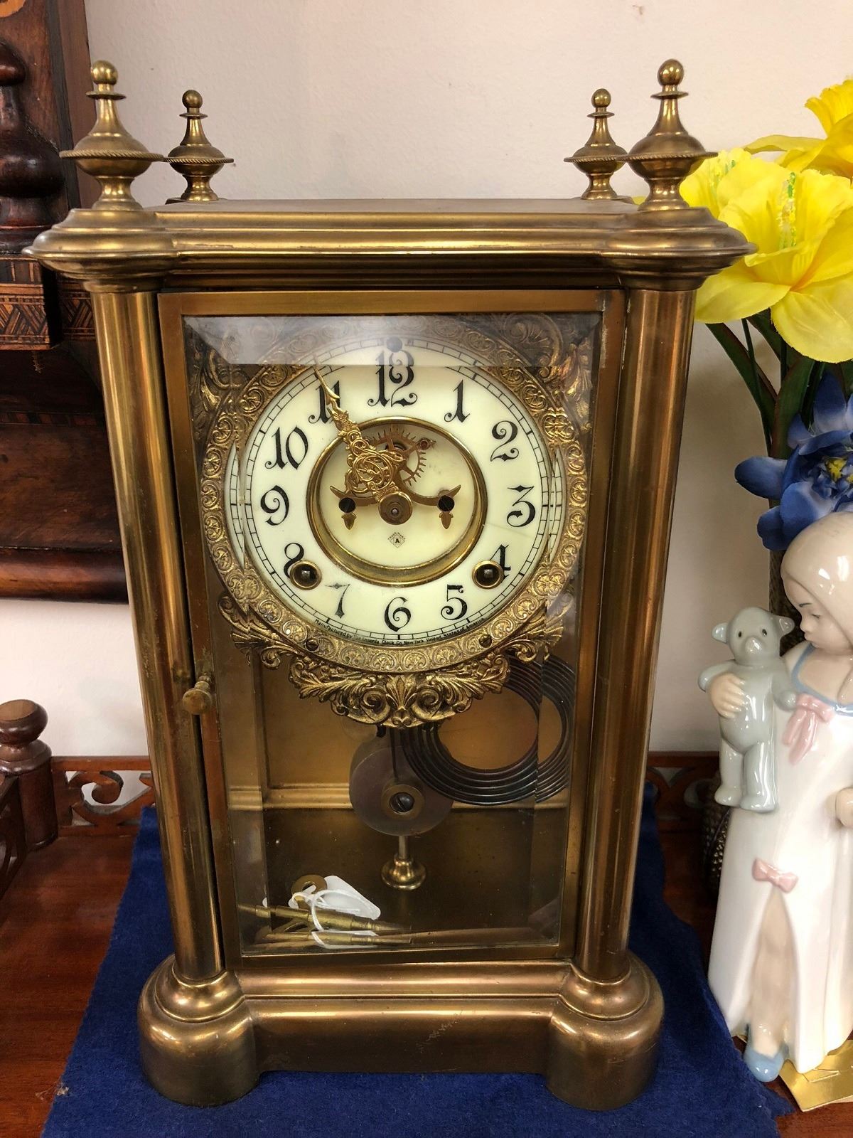 Ansonia Brass and Glass Crystal Regulator clock with finials and portrait pendulum in running condition. Beautiful clock, all glass is all there and all beautiful, pendulum is outstanding, 3 dimensional, and very ornate.