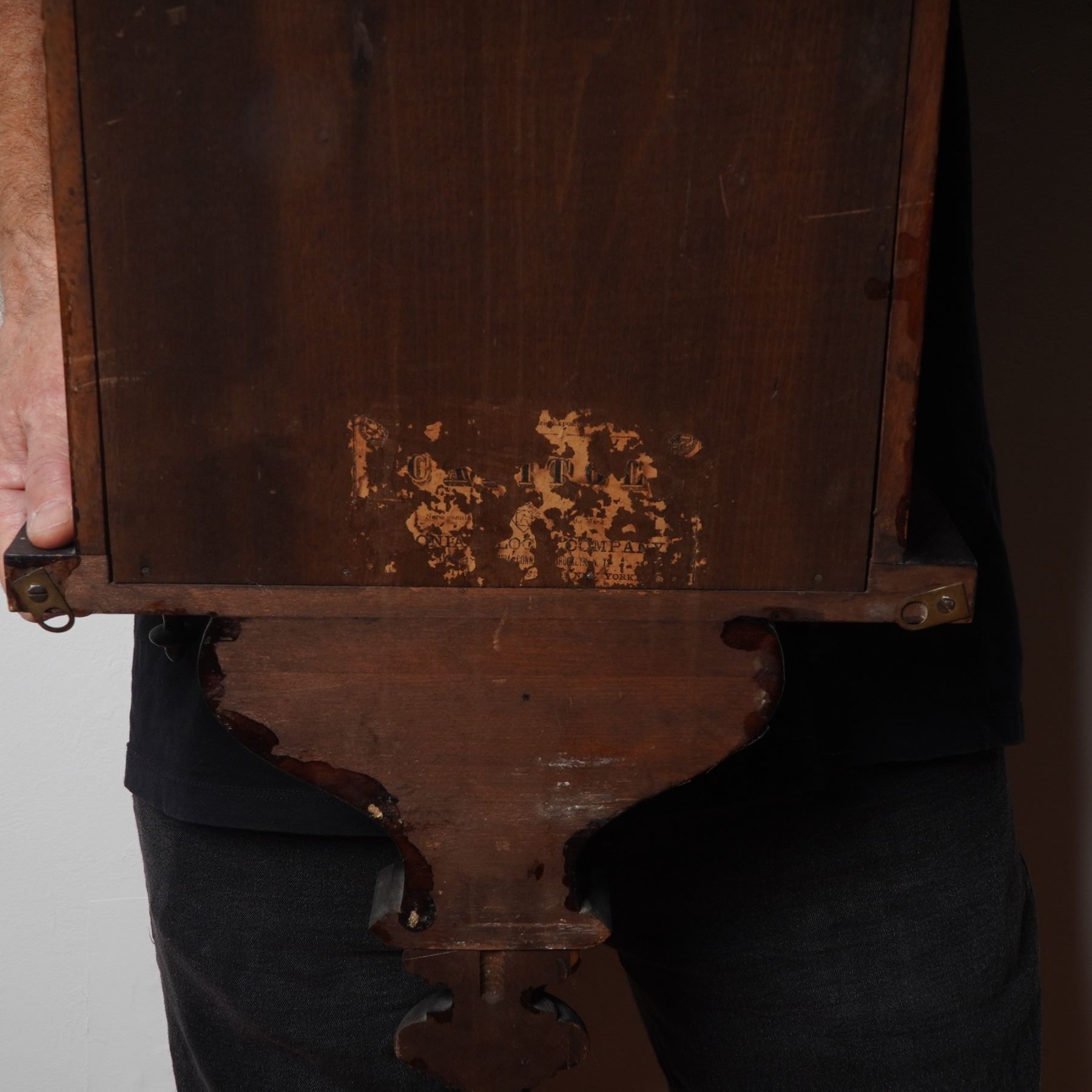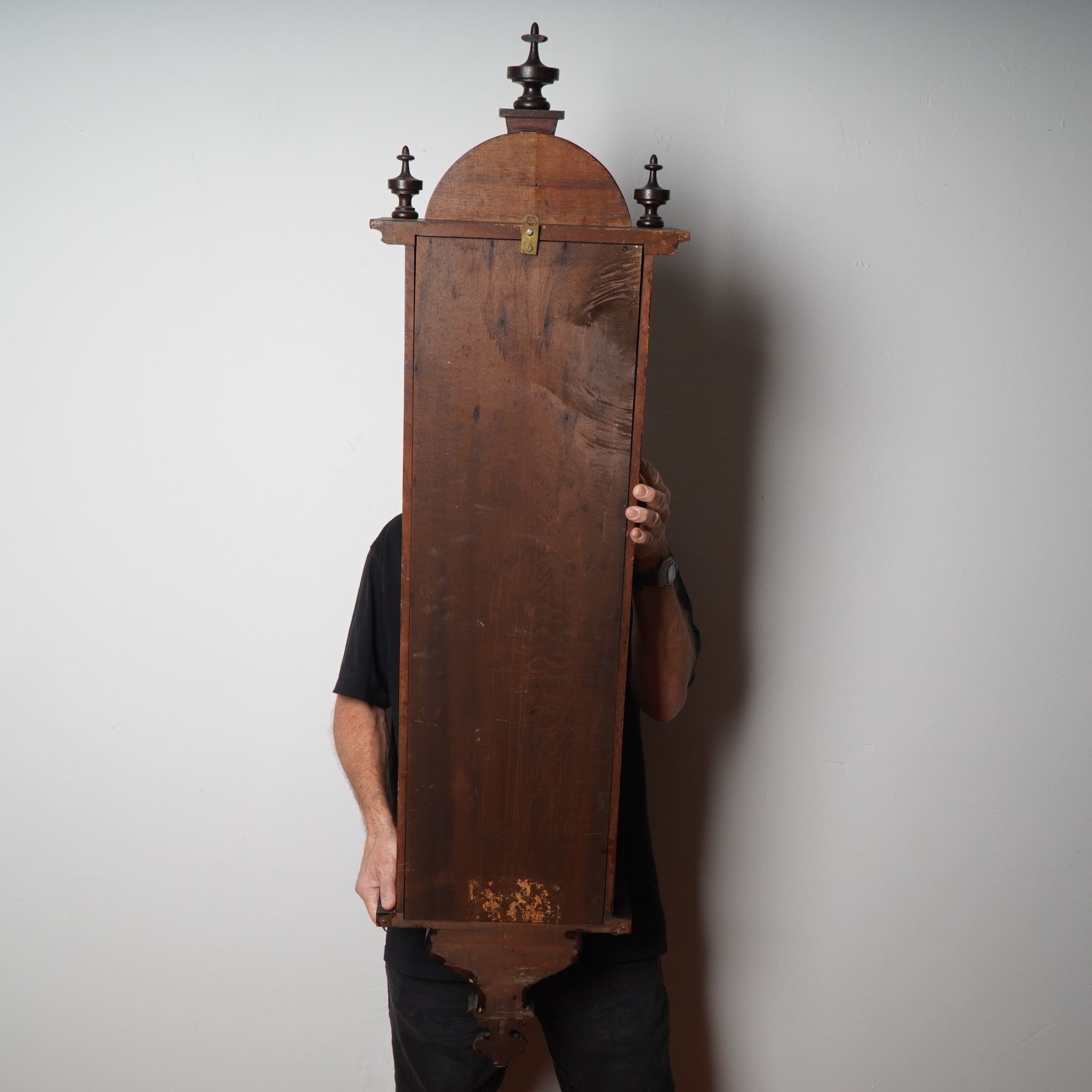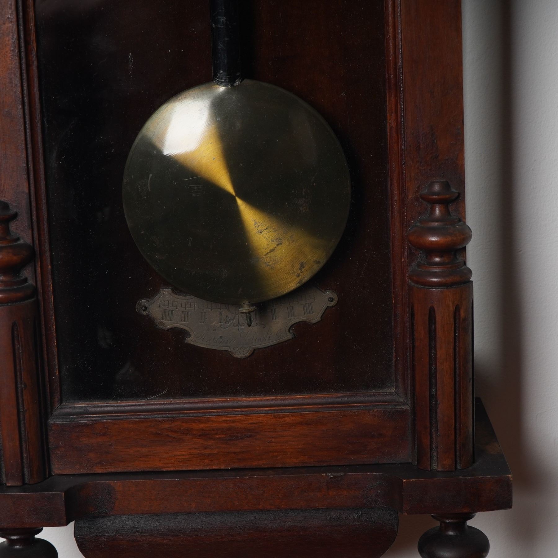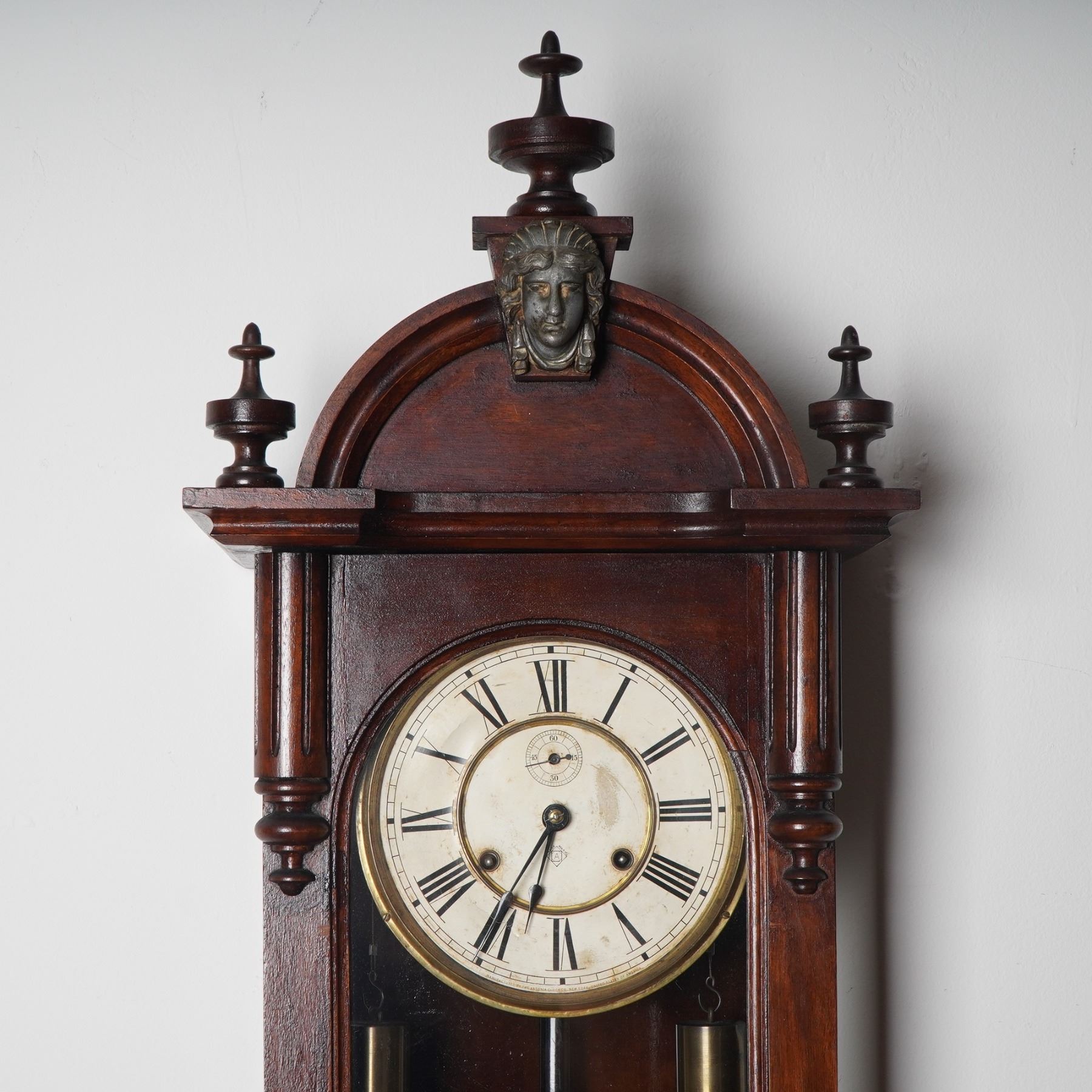 A captivating blend of precision timekeeping and sculptural elegance, this early 20th-century wall regulator by the Ansonia Clock Co. exemplifies the firm's mastery of both function and form. Housed in a stately walnut case with fluted columns, ornate turned finials, and a deep arched pediment, it is crowned by a dramatic cast-metal human mask crest, an artistic flourish echoing Ansonia's renowned figural and statuary clock lines. The painted Roman numeral dial features a subsidiary seconds register, while dual brass weights and a polished pendulum marked Ansonia Clock Co. speak to its mechanical authenticity. With remnants of the original paper label still visible on the reverse, this rare piece offers collectors an evocative intersection of decorative art and American horological history.