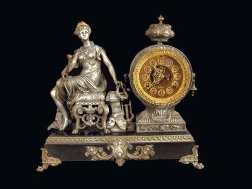 Ansonia Clock, depicting woman holding trumpet and wreath. White metal with gold leaf. Excellent condition. 17 1/2 X 16 inches.