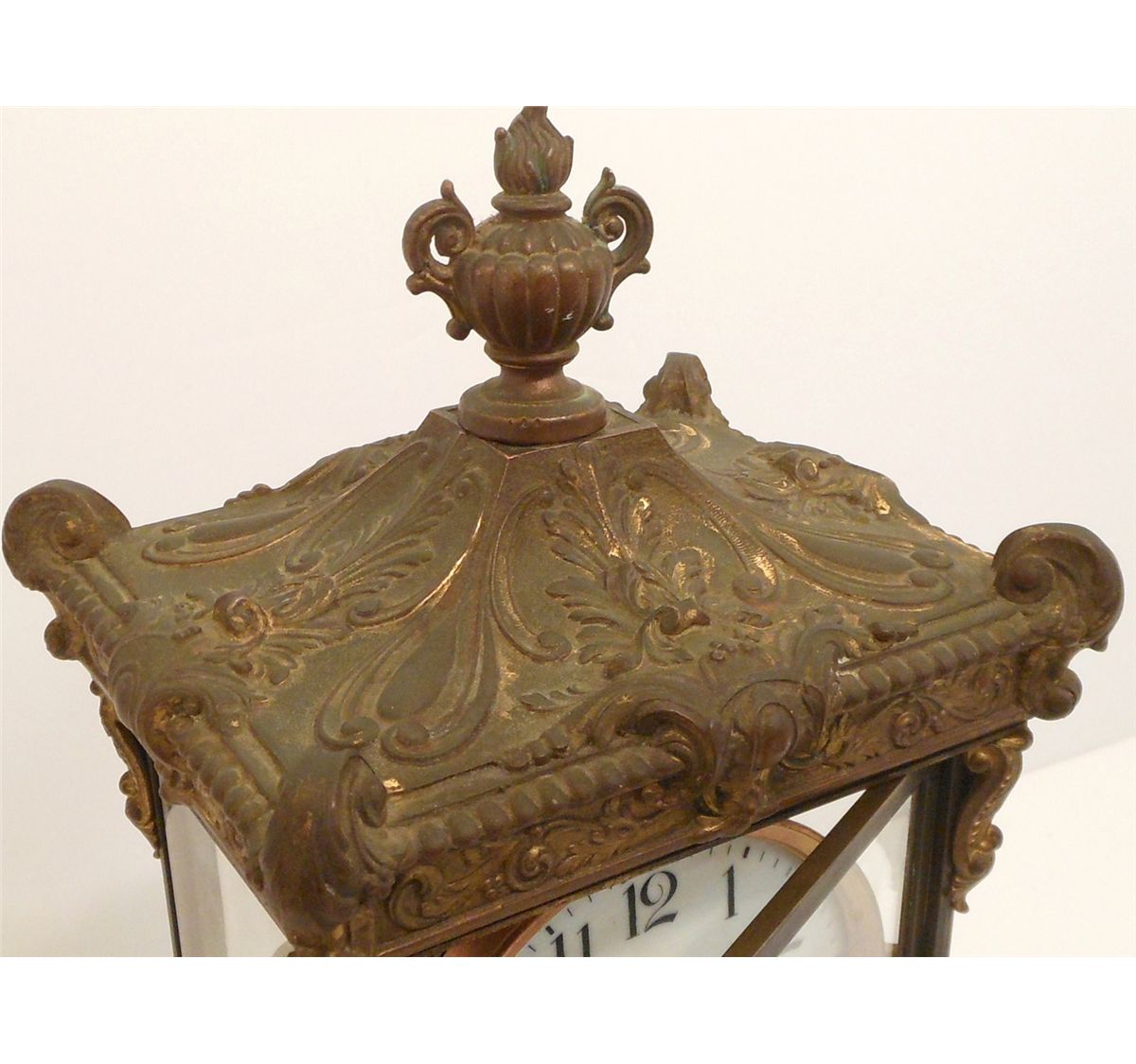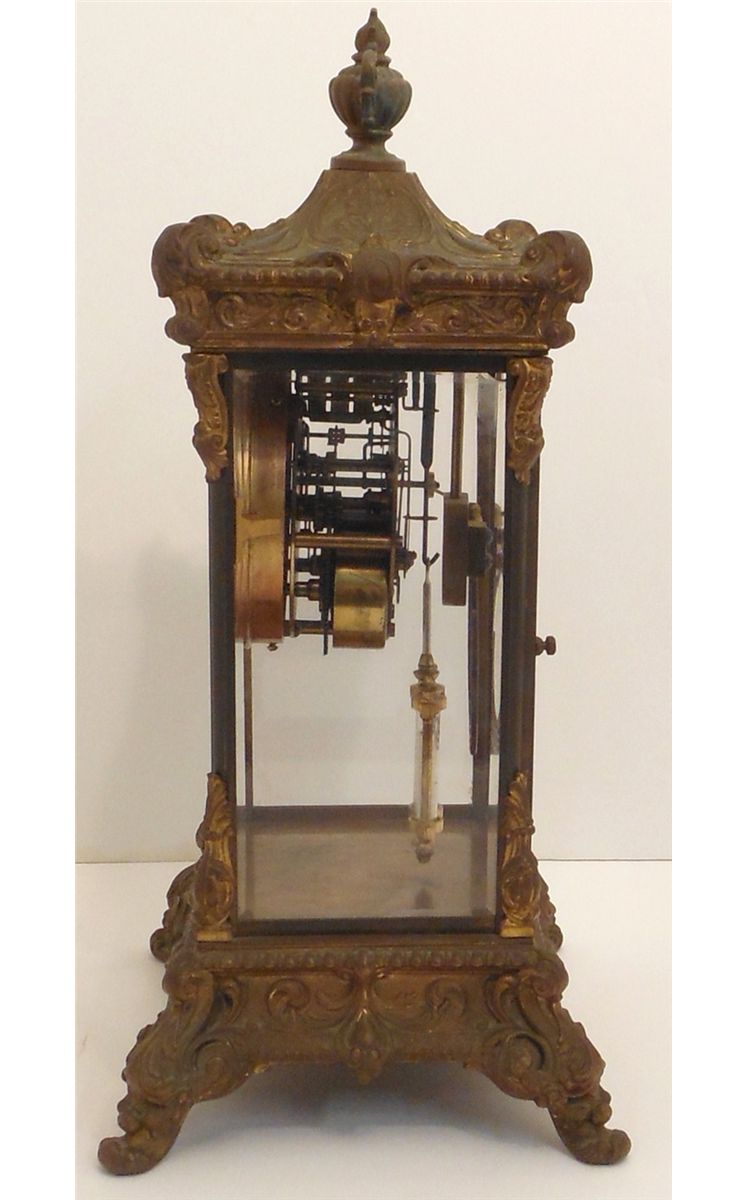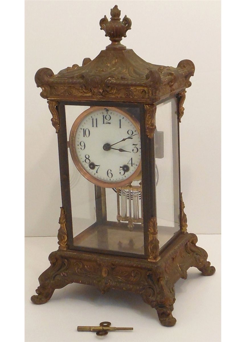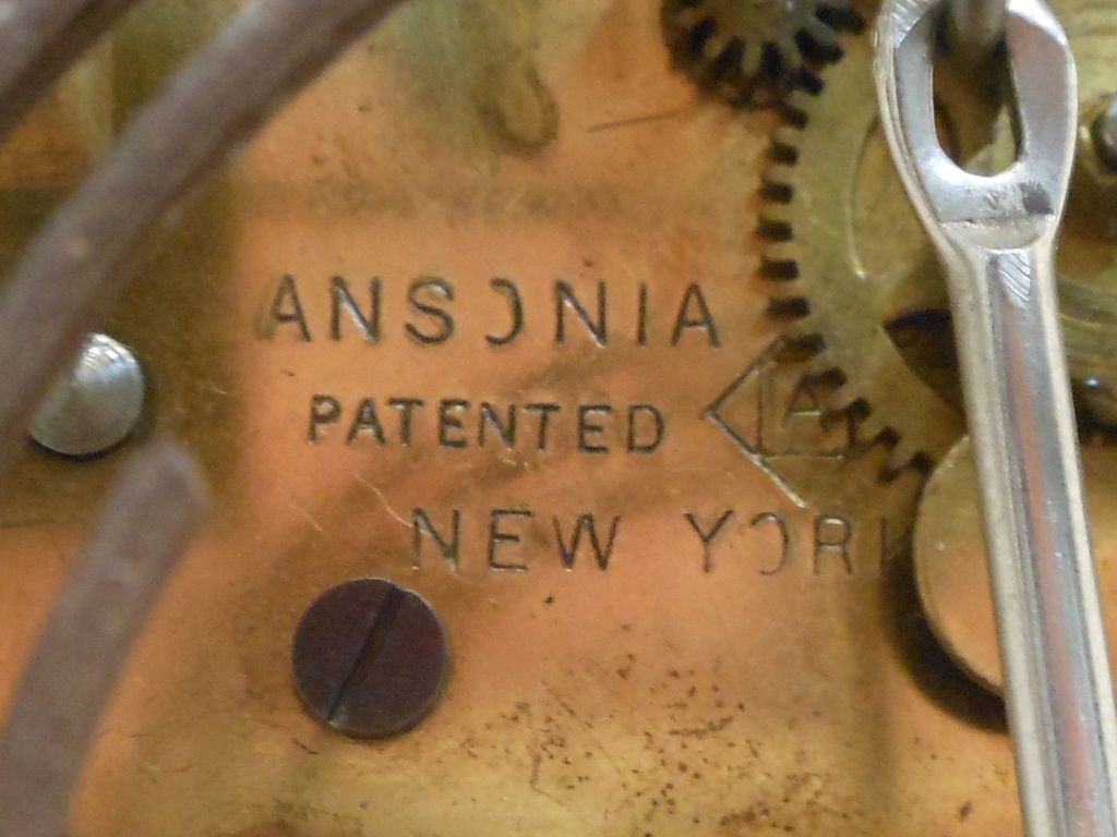 16 1/2" tall x 8 3/4" wide x 7 3/4" deep, Ansonia mantle crystal regulator, 'Elysian', circa 1915. Case is finished in Syrian Bronze, a dark copper finish. beveled glass panes, front has been replaced, one piece porcelain dial and is marked along the bottom. It has an eight day signed movement, strikes the half hours and hours on a hanging cathedral gong, pseudo mercury tubes in the pendulum. Great working condition. Finial is loose. Includes key.