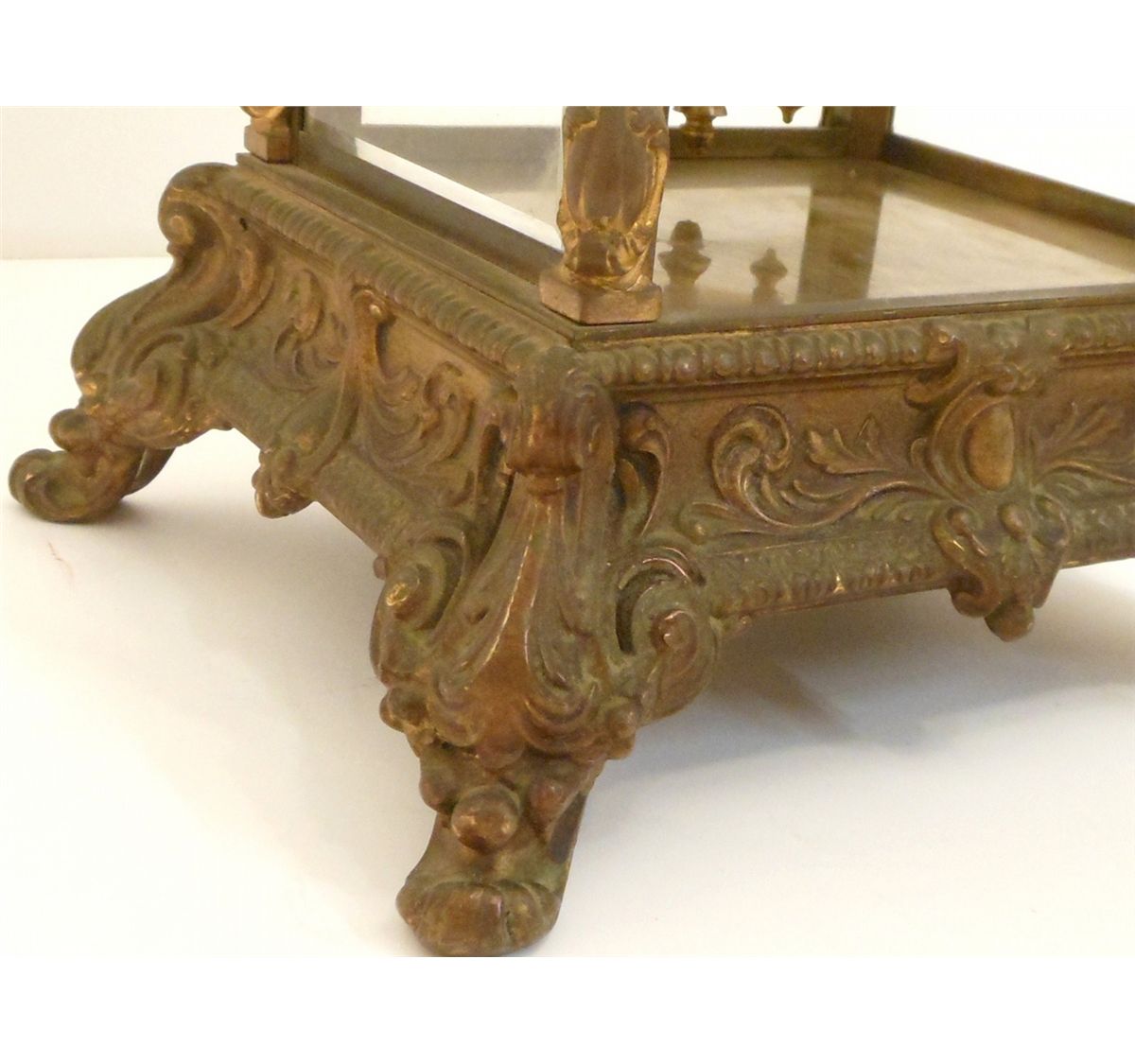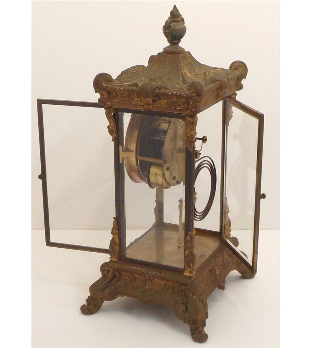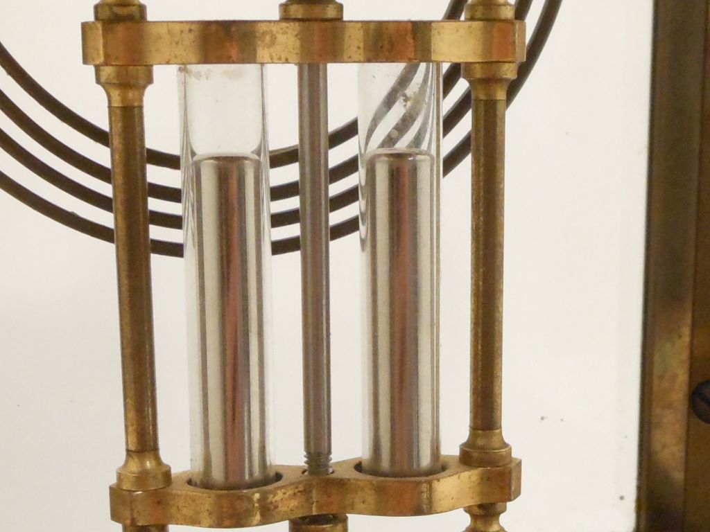 16 1/2" tall x 8 3/4" wide x 7 3/4" deep, Ansonia mantle crystal regulator, 'Elysian', circa 1915. Case is finished in Syrian Bronze, a dark copper finish. beveled glass panes, front has been replaced, one piece porcelain dial and is marked along the bottom. It has an eight day signed movement, strikes the half hours and hours on a hanging cathedral gong, pseudo mercury tubes in the pendulum. Great working condition. Finial is loose. Includes key.
