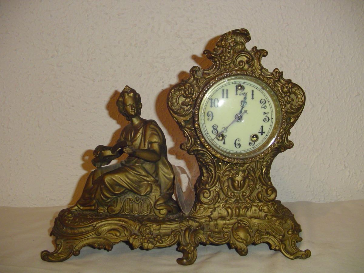 Very Fancy Ansonia Figural Mantle Clock Musician Playing Instrument Working Order
