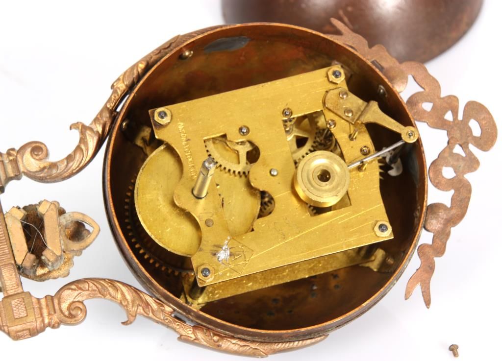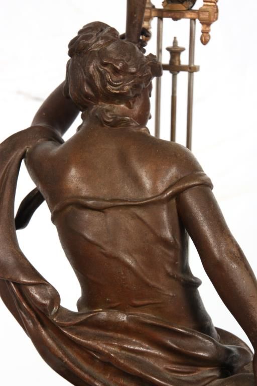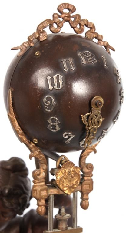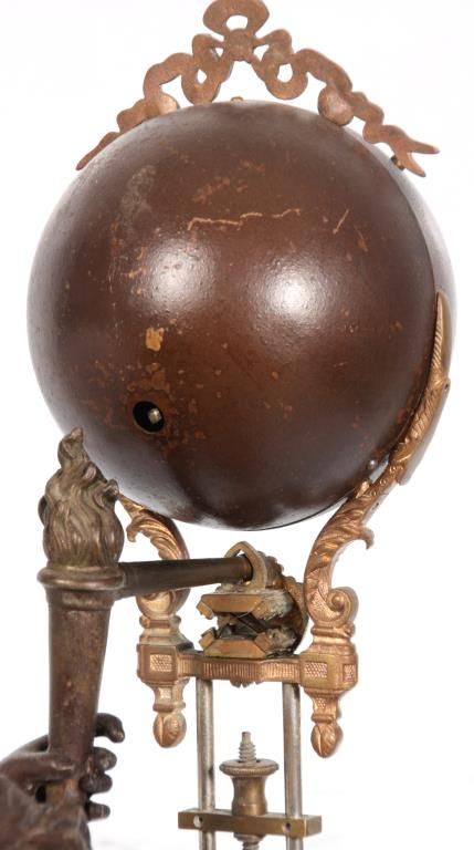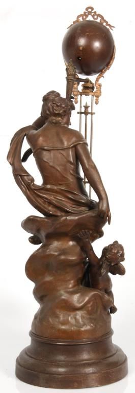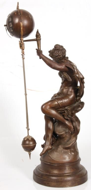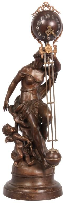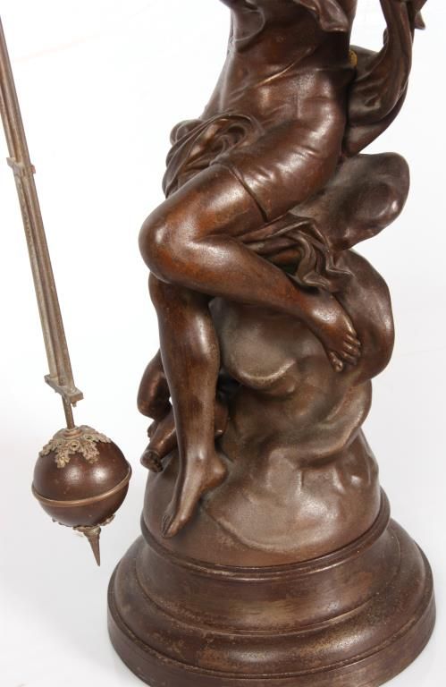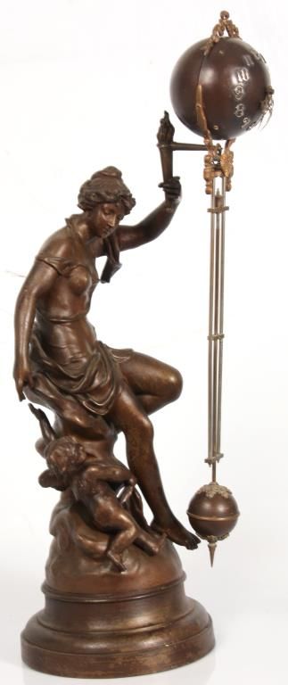 Ansonia Fortuna Swinging Arm Clock. Standing figure of the goddess of fortune floating among the wind with her light garments blowing, she is accompanied by a small cherub. Her left hand holds a torch on which the clock hangs from a crossed suspension; the long gridiron pendulum is mounted with a spherical bob at the bottom and cylindrical dial at the top encasing the spring driven movement, signed with the Ansonia Clock Co. trade mark; the dial has applied silvered hour numerals and gilt pierced filigree hands. Original finish on the sculpture is worn. 32 in. high.
