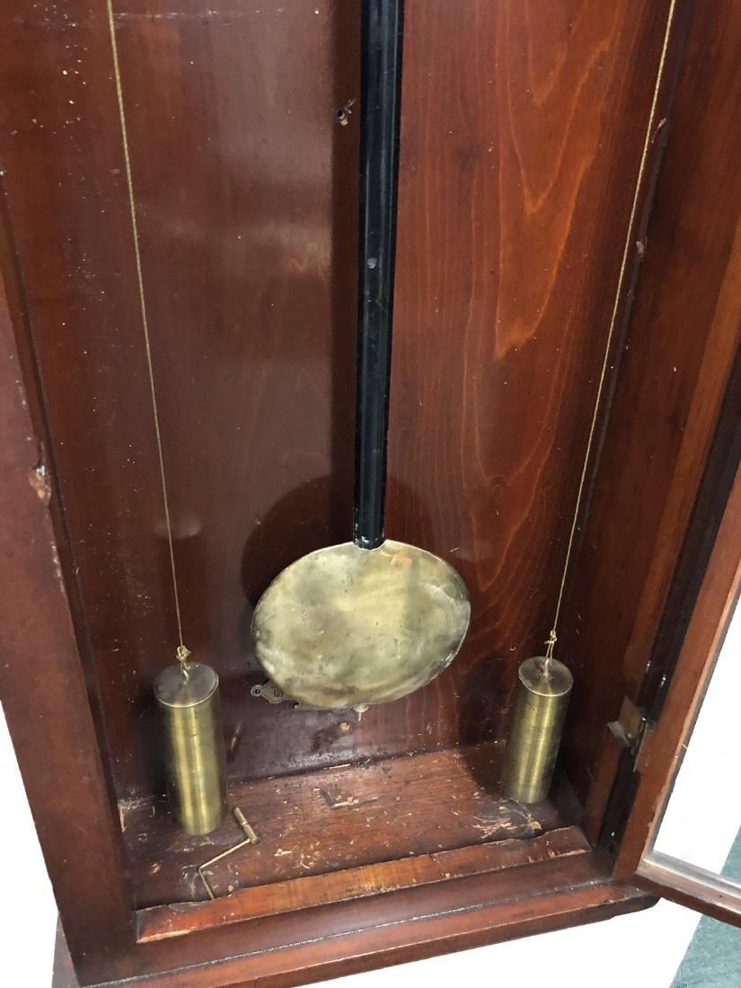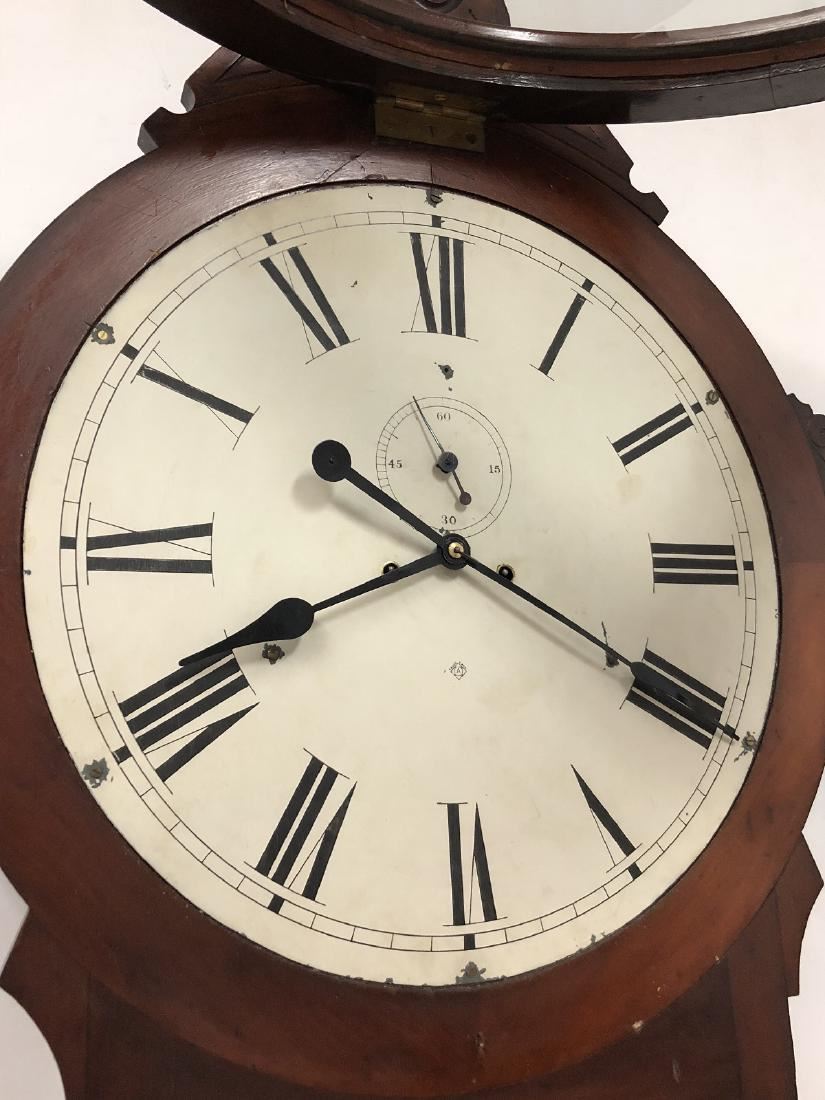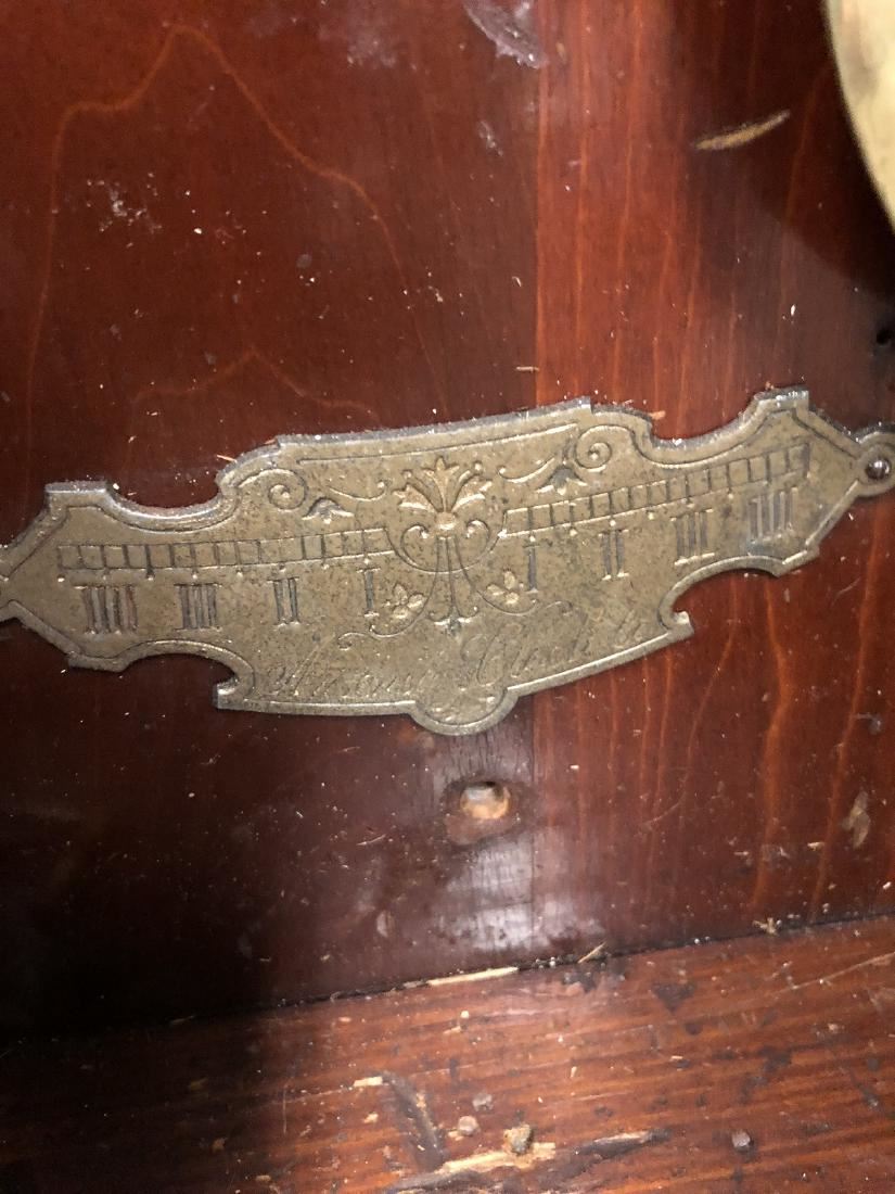 Ansonia "General" Regulator Wall Clock. Cherry or walnut case, all original, still in running condition, weight driven, possibly hung in an early railroad station. Has the sweep second hand, has the original pendulum, weights, measures approx. 6 ft.(72") tall x 20" wide.