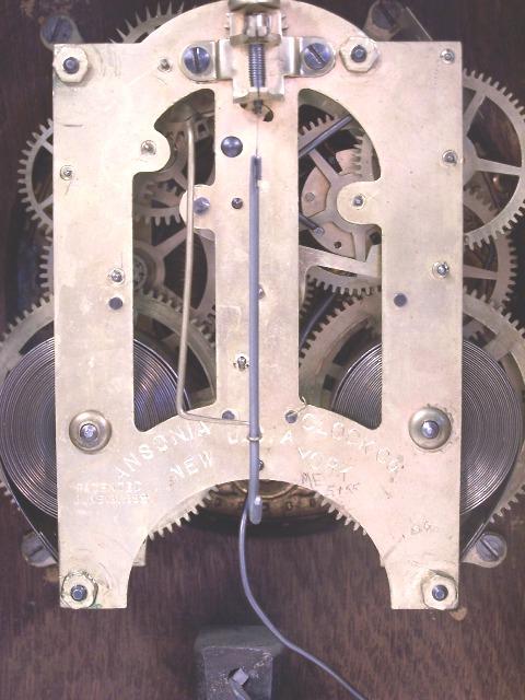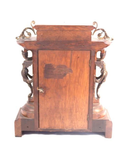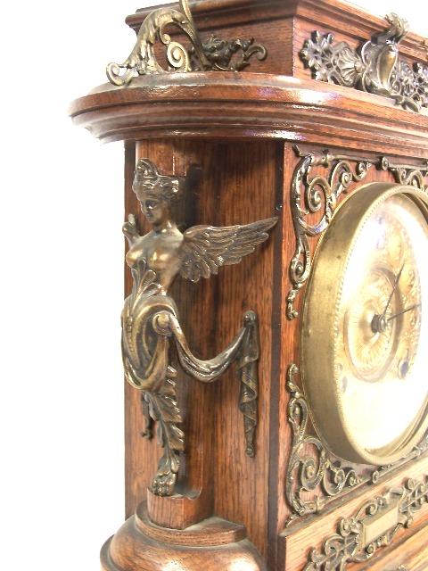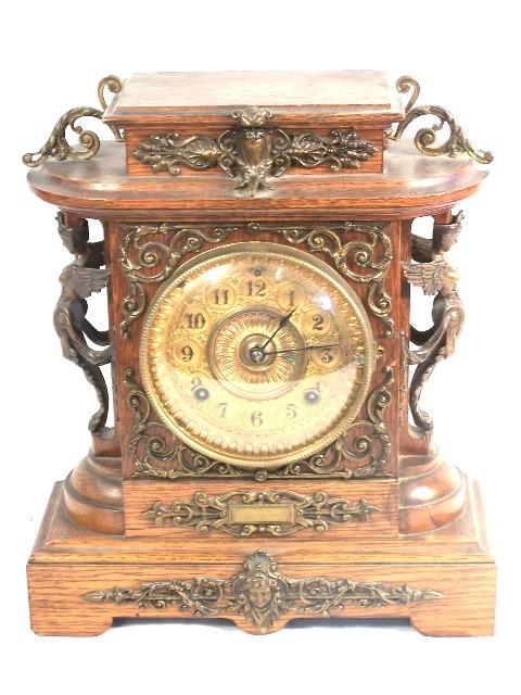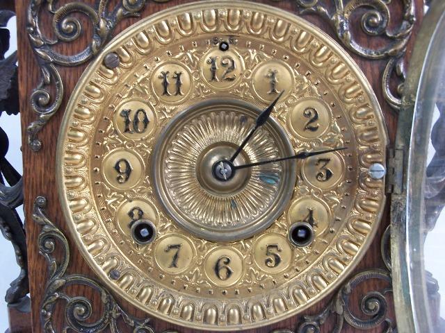 Very ornate metal work throughout, brass face, contained in oak case. Ansonia NY works as shown in photo. Condition, has had small repair work to top left portion of case, replaced hinge for bubble glass cover and seems not to be working!