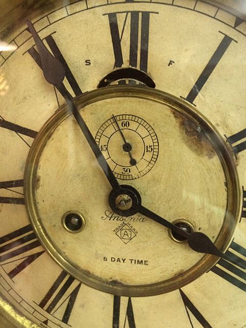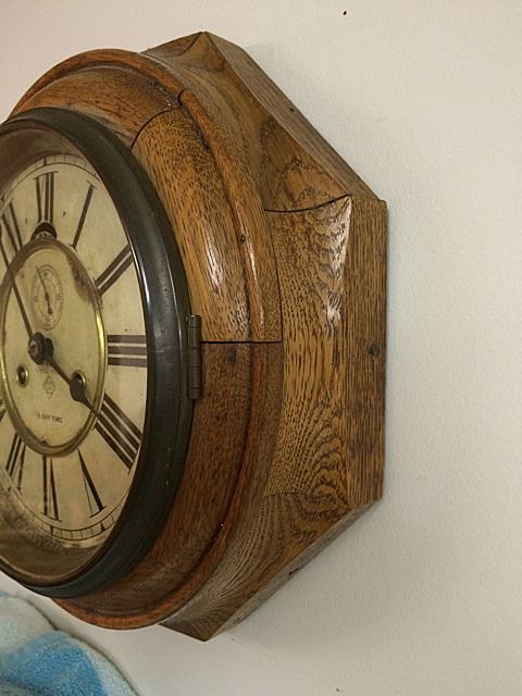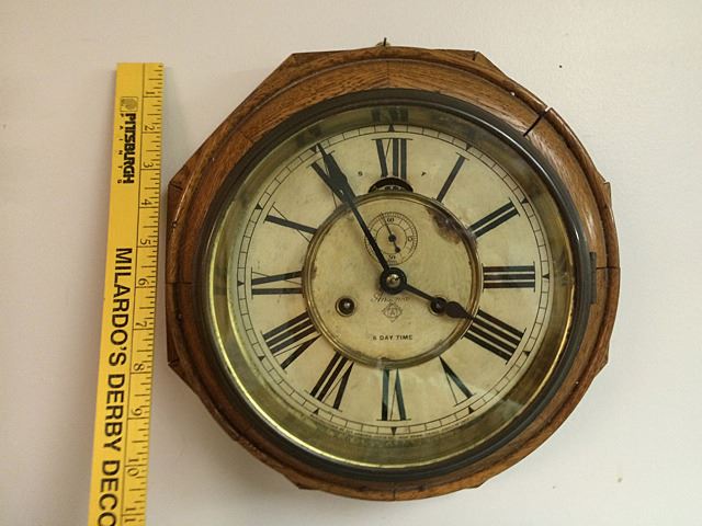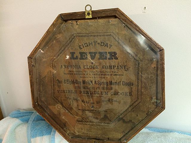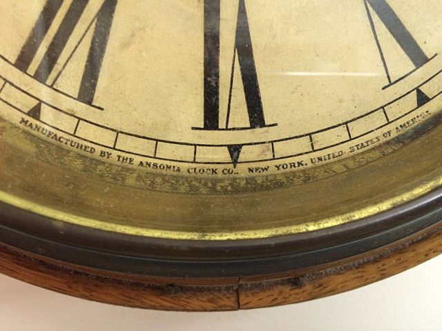 Ansonia Clock Company 8 Day Lever Oak Gallery Clock with second hand, very nice label on back. Measures approx. 10 1/2"